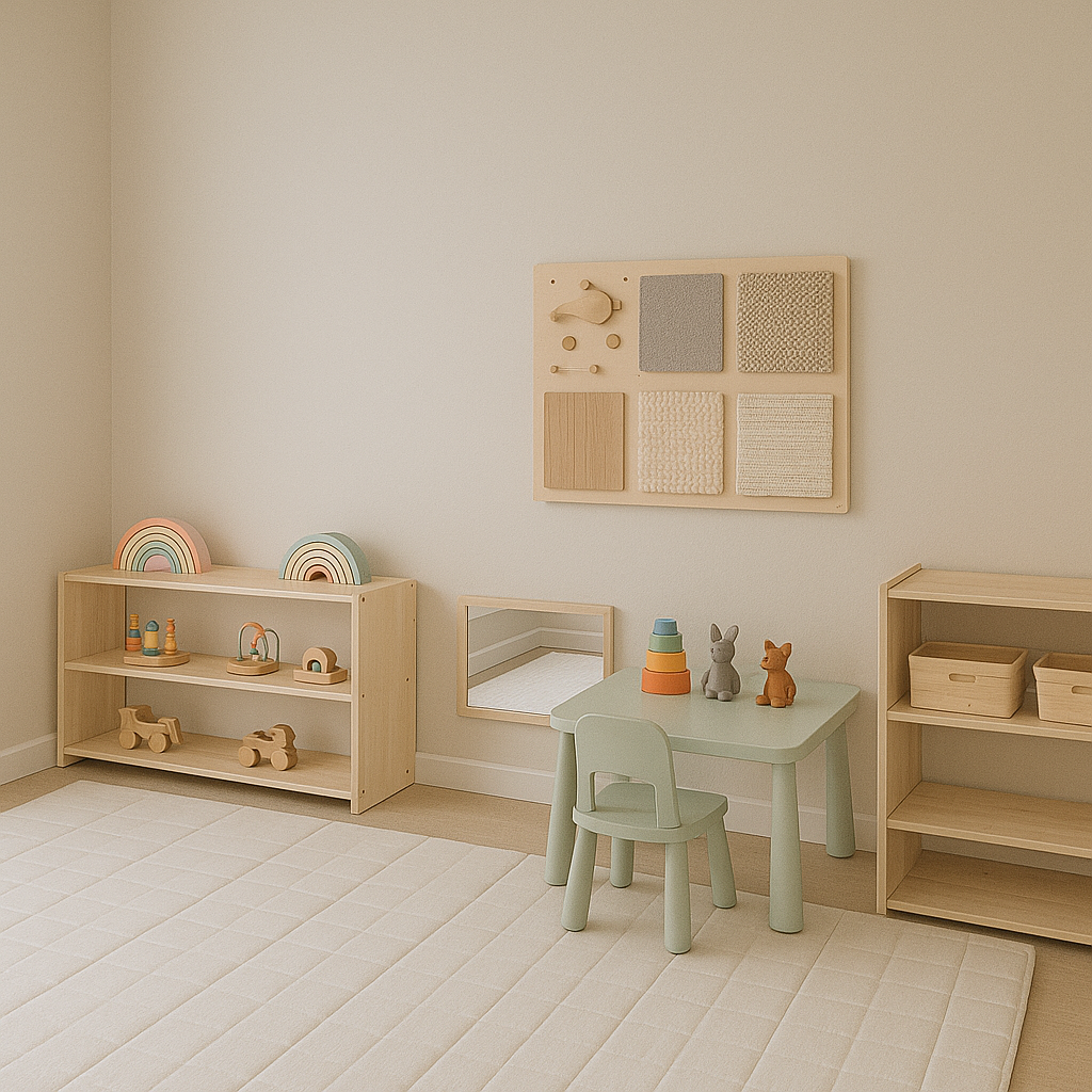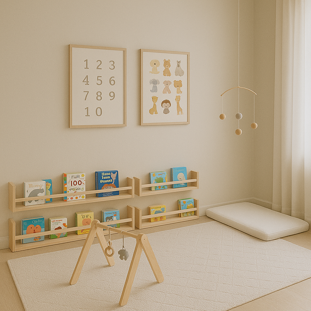 Montessori-inspired rooms are designed with the baby’s movement and independence in mind. Low beds, reachable bookshelves, and soft rugs turn the space into a place for learning and discovery. The materials are natural wood and cotton while the layout stays open. Instead of flashy decor, the style speaks through quiet function. It’s a child-centered design that supports calm play and early exploration.