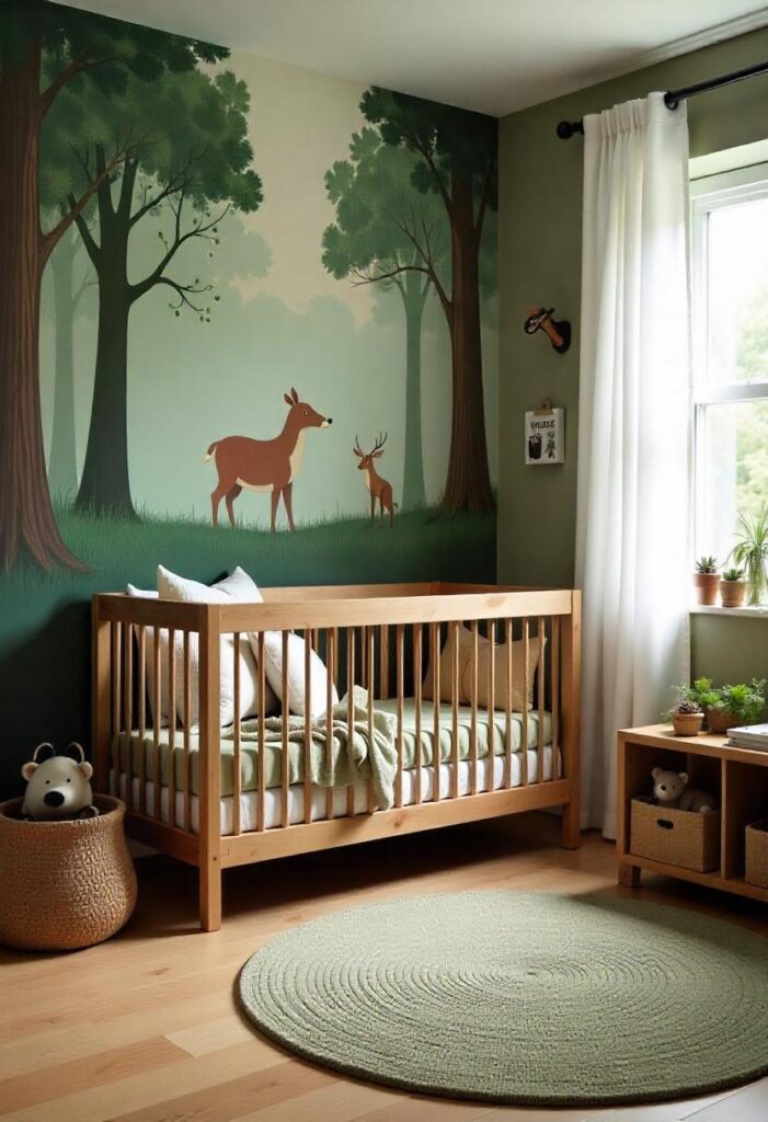 Bringing in natural textures and colors creates a grounded, serene nursery. Elements like leafy wallpaper, wooden animal toys, or earthy green tones help set a quiet outdoor mood. Rattan baskets, botanical prints, and soft blue fabrics offer texture without relying on trends. This approach is often chosen by parents looking for a nursery that feels peaceful and connected to the outdoors.