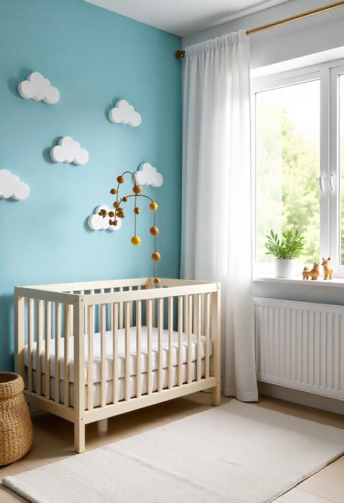 Adding a bold element to one wall or the ceiling brings character to a nursery without overwhelming it. A mural of clouds or a hand-painted moon above the crib adds charm to the room. The rest of the room stays light and restrained to let the design breathe. A single feature wall allows parents to add creativity while keeping the space restful. This contrast adds personality without making the space busy.