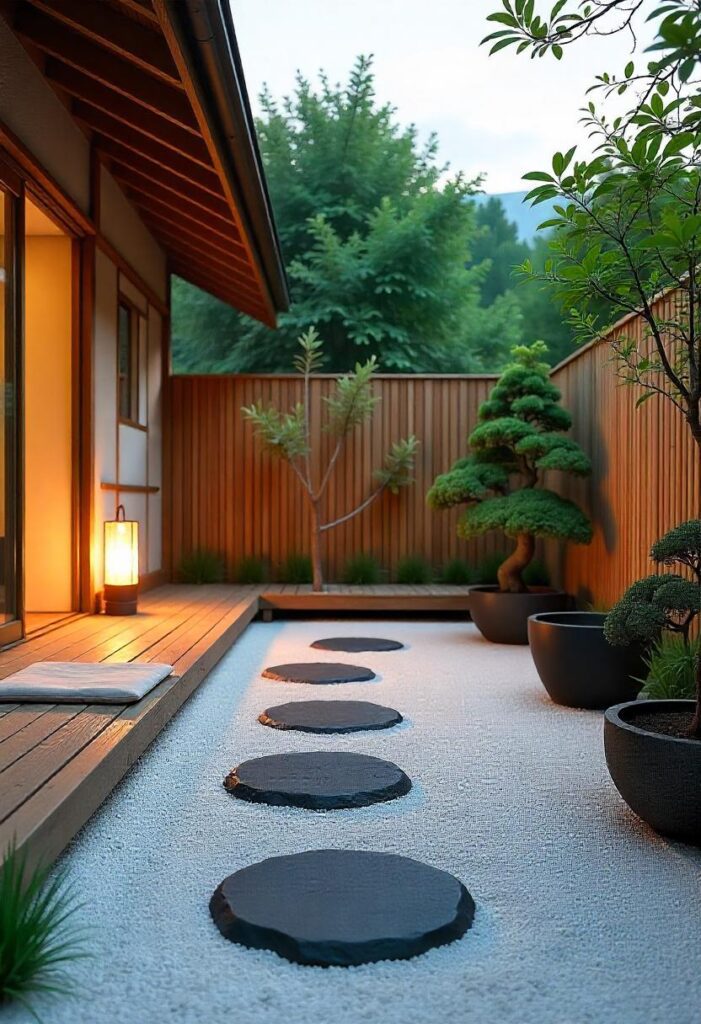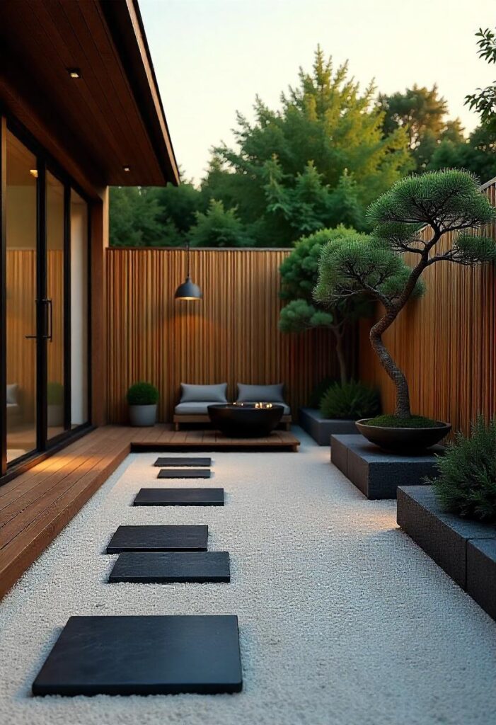 This patio style emphasizes clarity and balance. Pale gravel grounds the space, while oversized stepping stones lead through it with quiet precision. Bamboo fencing adds structure, and low wooden platforms invite seated reflection. A curated mix of bonsai and dark ceramic planters completes the scene. The result is a sanctuary for rest and focus.