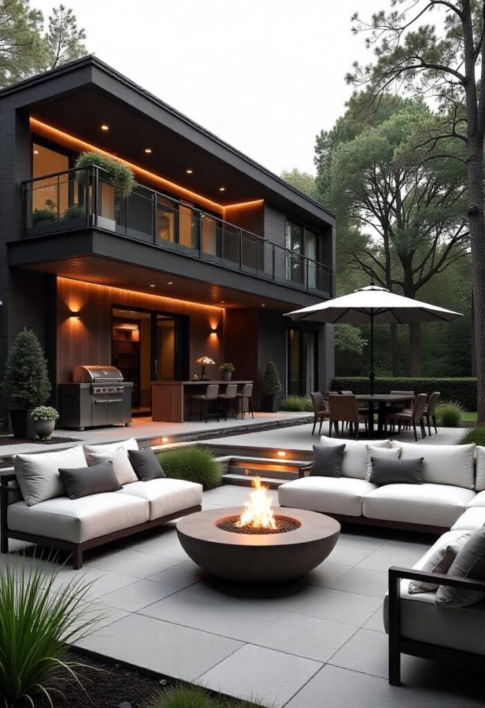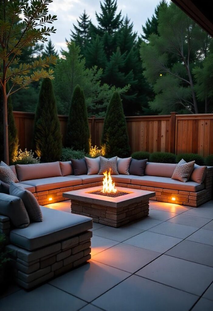 A recessed patio lounge creates a sense of enclosure that draws people in naturally. By dropping the floor level just enough to feel separate from the rest of the yard, the space becomes its own destination. Wraparound bench seating in stone or teak frames a central fire pit, offering both warmth and comfort. Soft under-seat lighting introduces atmosphere without distraction. It’s an elegant design for hosting intimate gatherings any time of year.