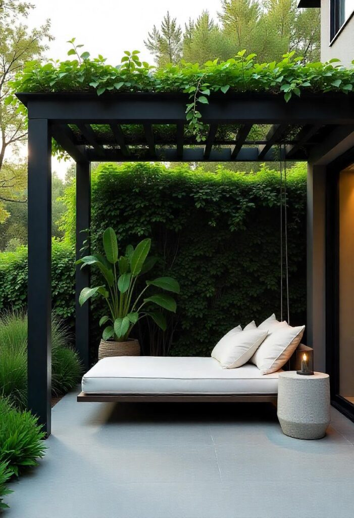 This design turns a pergola into a sculptural centerpiece by topping it with a planted green roof. Beneath, a suspended daybed hangs in quiet suspension, offering a shaded retreat with a sense of lightness. Rope or black steel chains support the structure while doubling as design details. Surrounding it, ivy-covered walls or tall planters introduce privacy without harsh lines. The space feels both romantic and architecturally grounded.