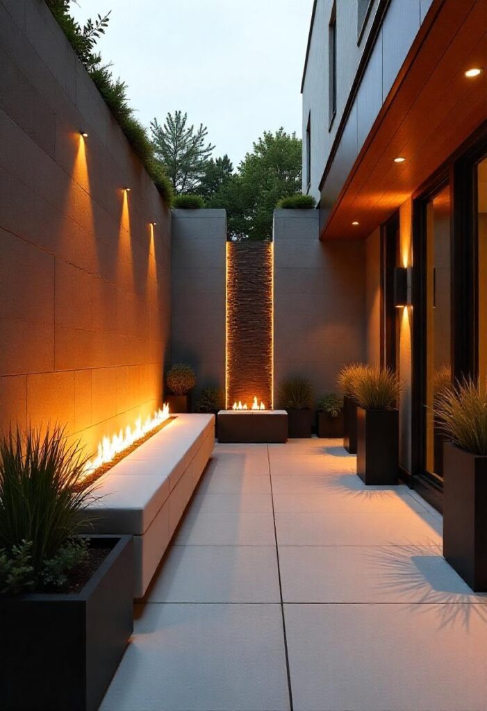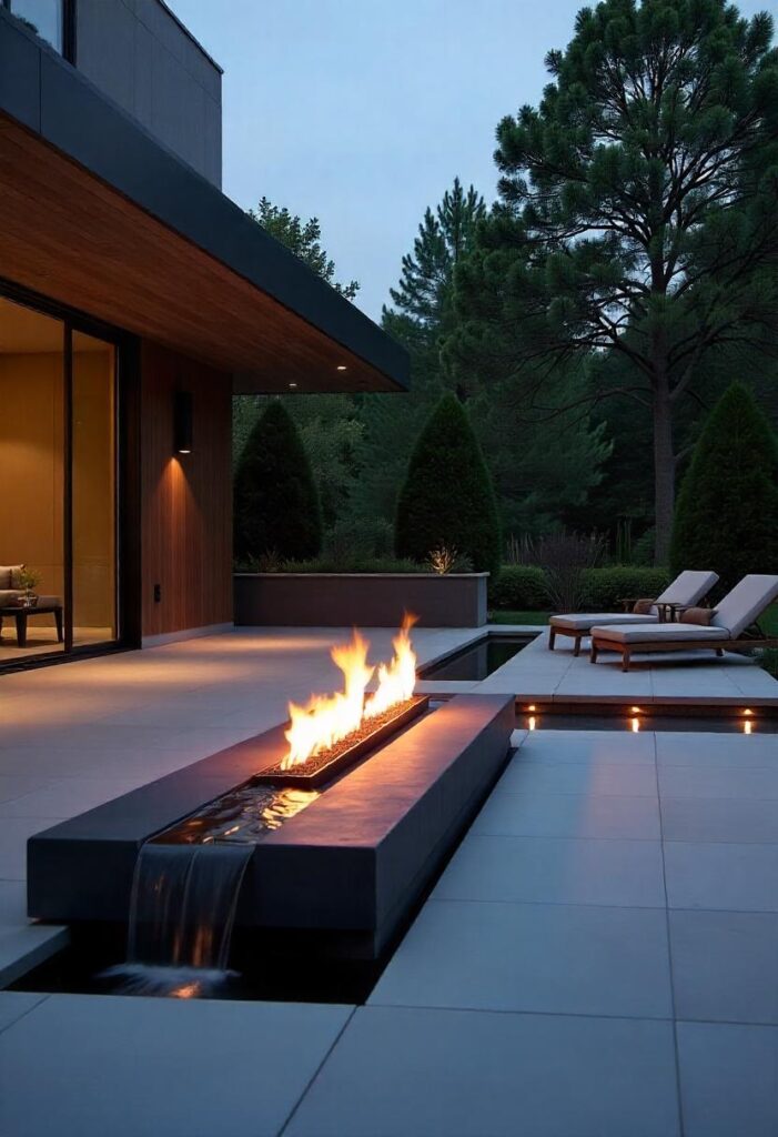 7. Modern Minimalist Patio with Fire Strip and Water Wall