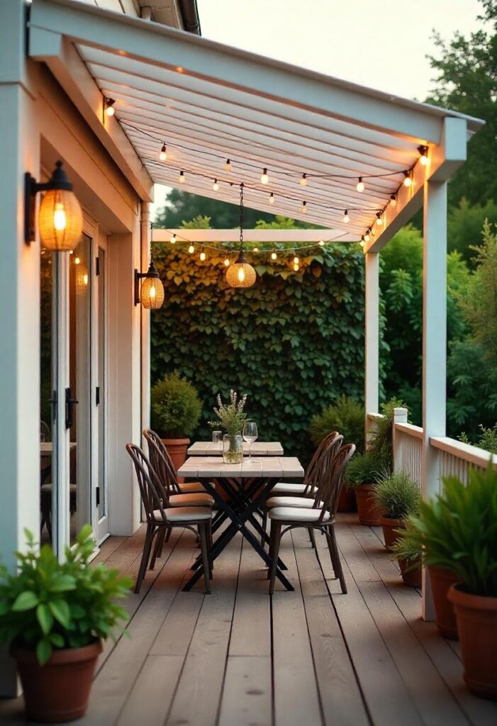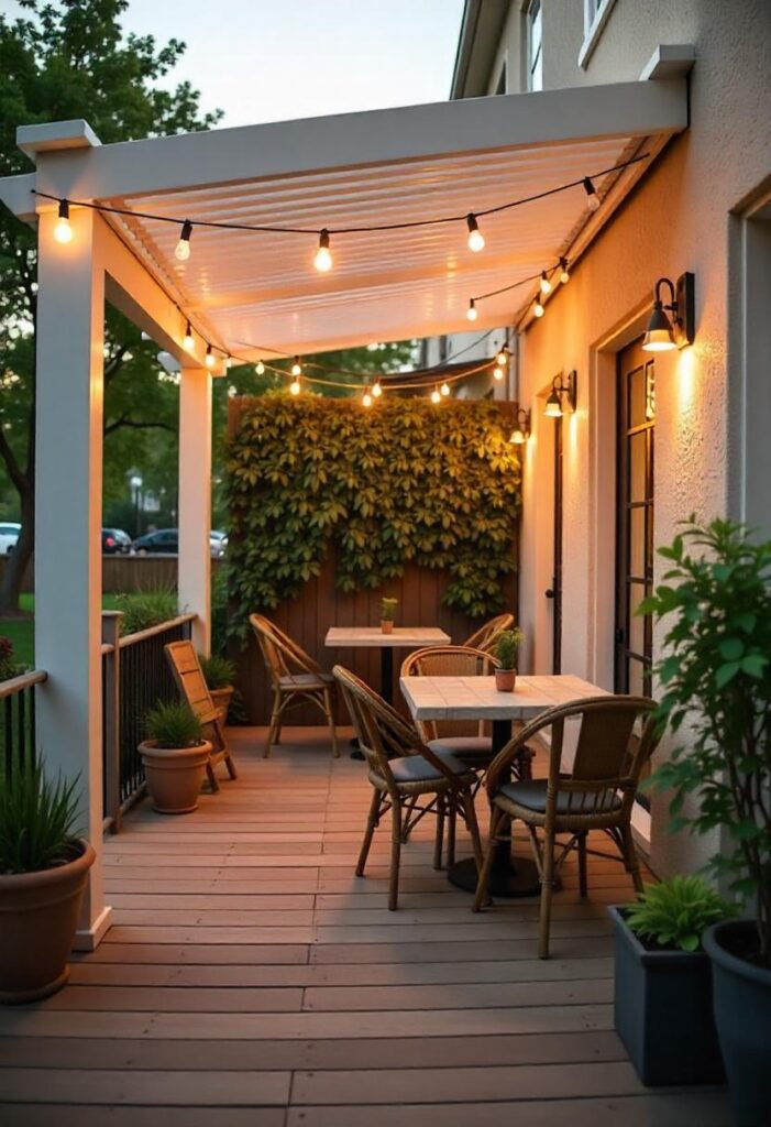 Raising the patio deck introduces subtle zoning that gives this small space a sense of elevation. A louvered roof overhead allows for controlled light and ventilation throughout the day. The bistro-style setup, complete with tiled tables, rattan chairs, and hanging planters, feels more like a courtyard café than a suburban backyard. Accent lighting brings the space to life in the evening.