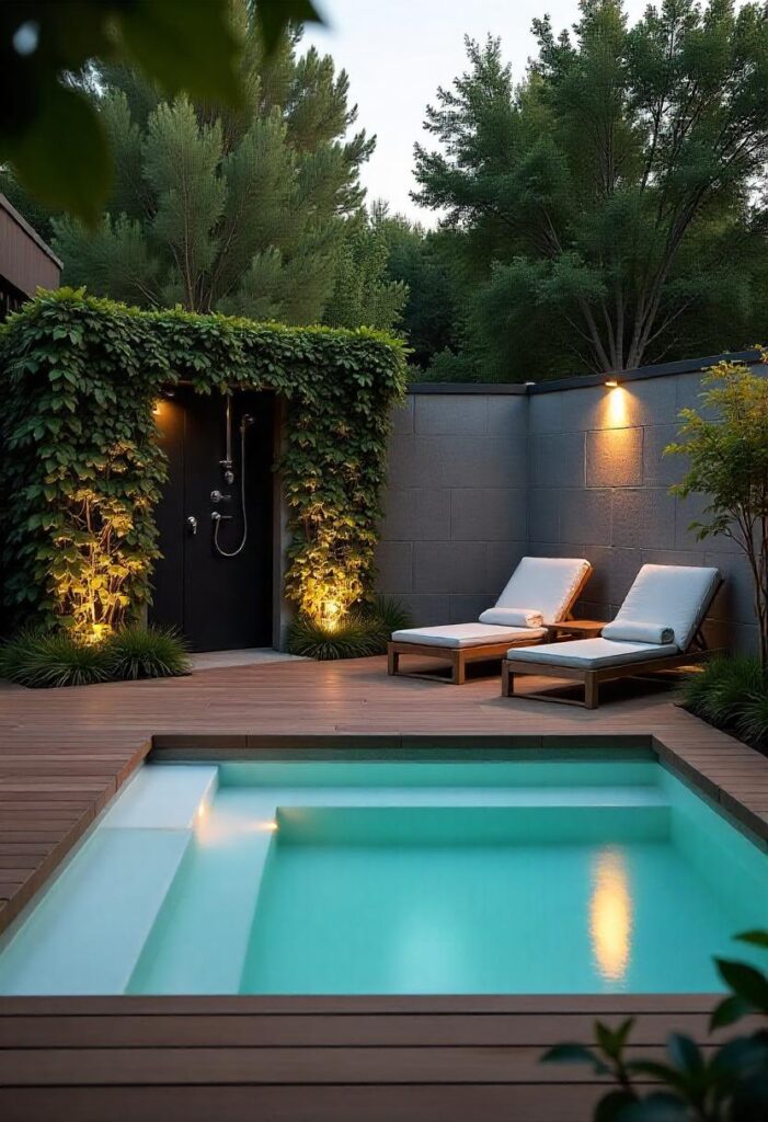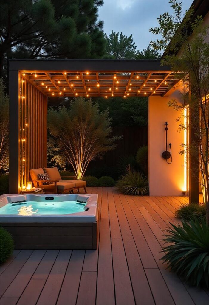 Placing a hot tub into a sunken portion of the patio adds privacy, stability, and elegance to the overall design. Trellis walls wrapped in vines like jasmine or wisteria enclose the area without making it feel heavy. A teak shower nearby introduces the practicality of rinse-off access. Lounge chairs with weather-resistant cushions complete the zone. This is a wellness-focused space designed for quiet luxury and relaxation.