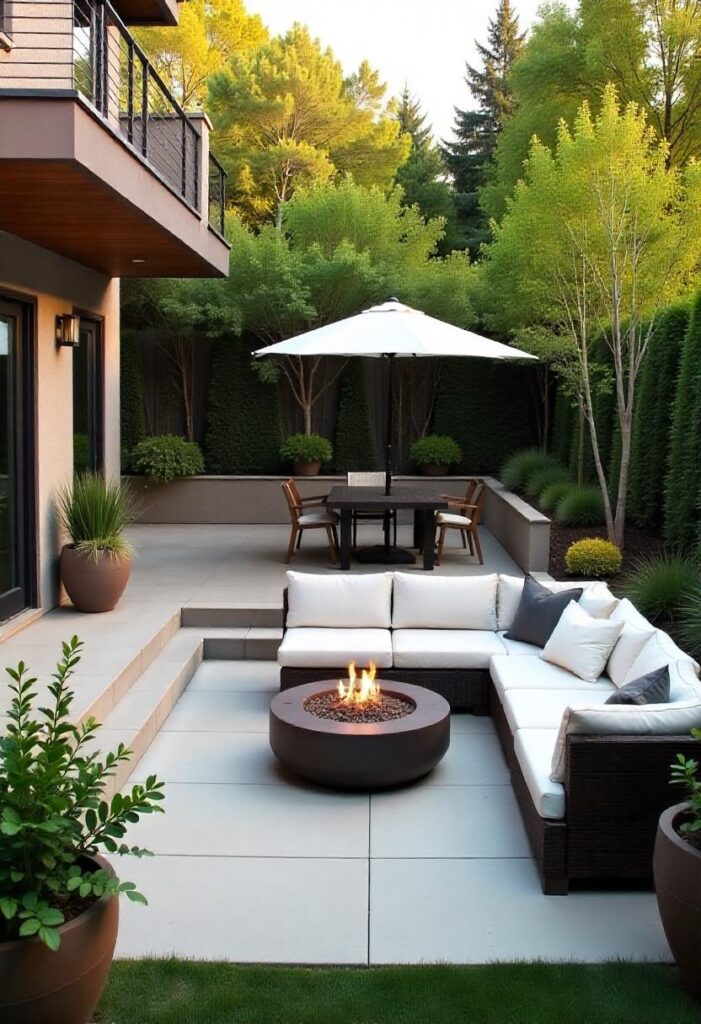 A tiered patio layout makes each function feel distinct while maintaining a cohesive flow across the entire yard. The highest level might serve as a grilling station or bar, the middle for outdoor dining, and the lowest for lounging by a fire pit. Varying the surface materials between levels adds visual structure. This design works especially well for sloped lots or homeowners seeking to organize their outdoor activities without barriers.