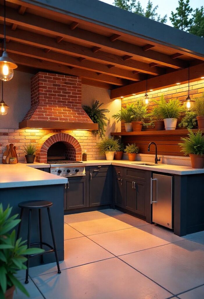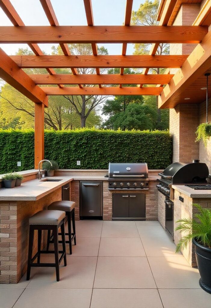An outdoor kitchen takes on a new level of sophistication when placed beneath a well-built pergola. With a wood-fired pizza oven, built-in grill, bar seating, and stone countertops, this patio becomes an open-air culinary hub. The structure provides needed shade while also framing the cooking area as a permanent part of the landscape. Hanging herb baskets and climbing vines soften the lines.
