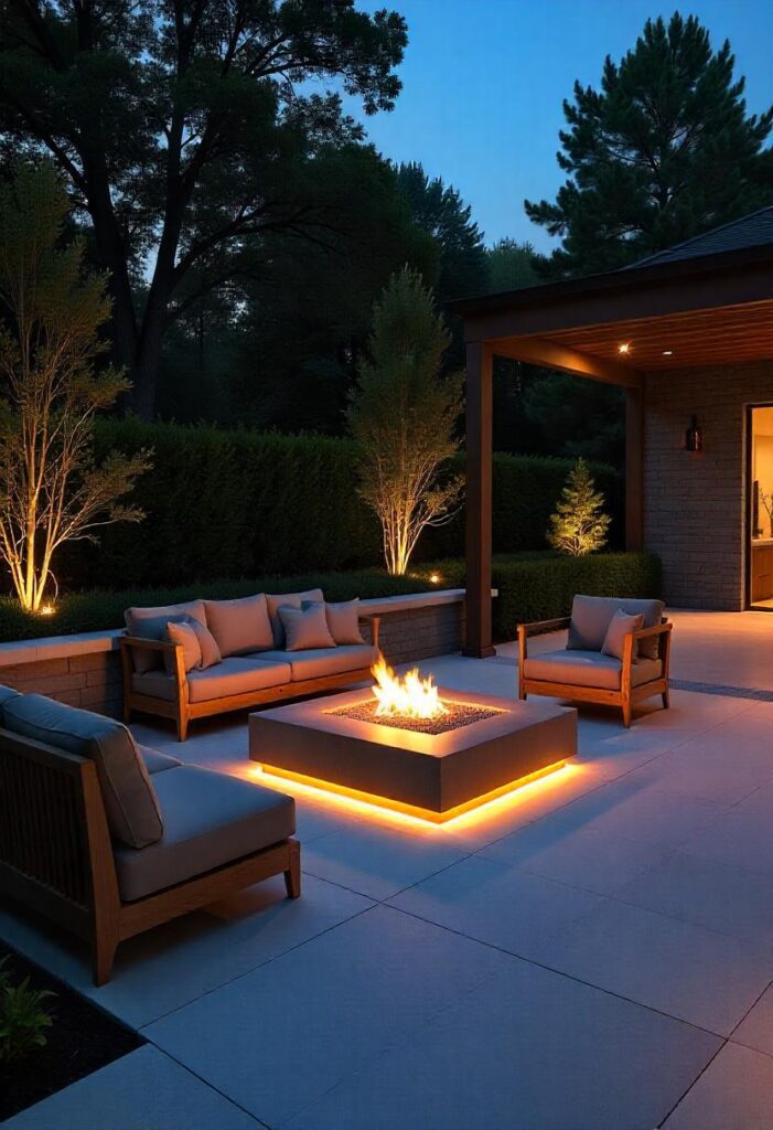A recessed patio lounge creates a sense of enclosure that draws people in naturally. By dropping the floor level just enough to feel separate from the rest of the yard, the space becomes its own destination. Wraparound bench seating in stone or teak frames a central fire pit, offering both warmth and comfort. Soft under-seat lighting introduces atmosphere without distraction. It’s an elegant design for hosting intimate gatherings any time of year.