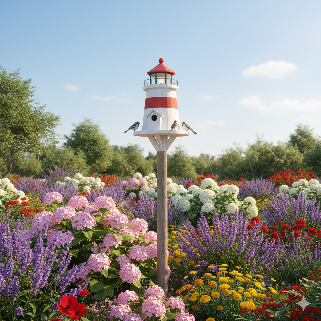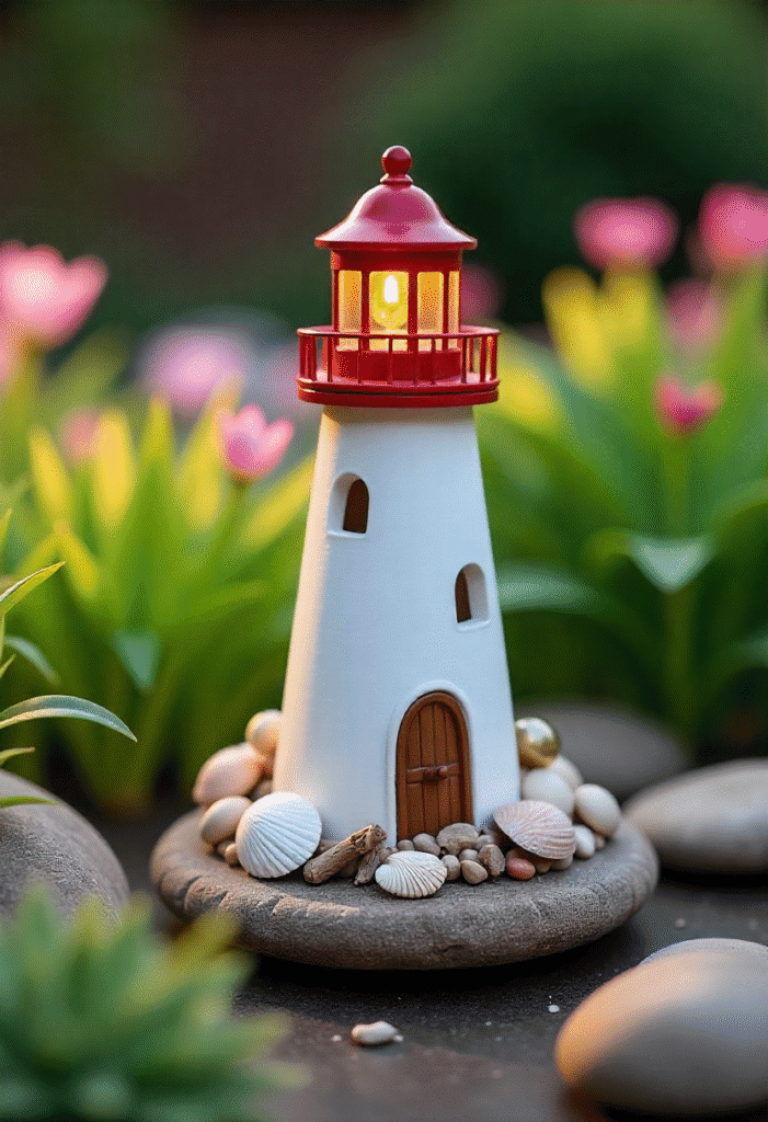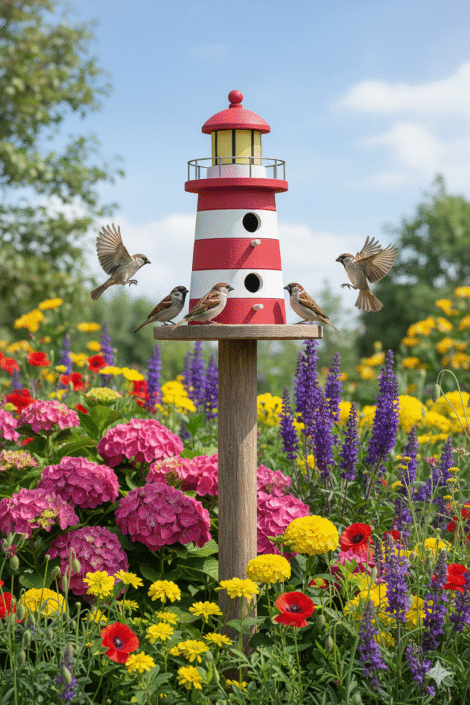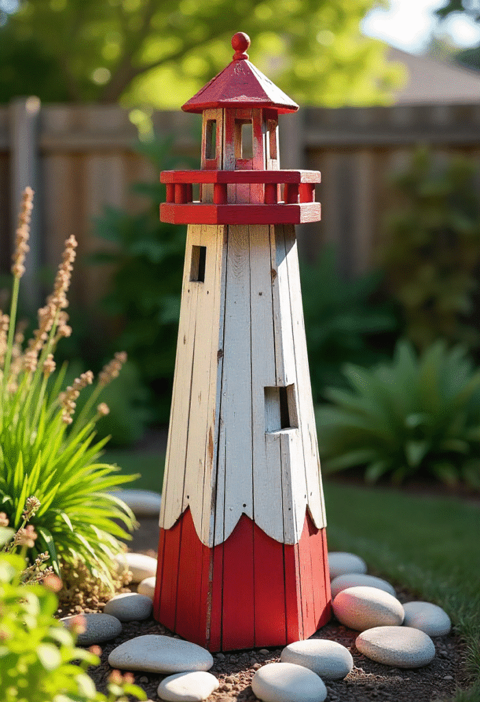 If you enjoy watching birds, try adding a lighthouse-shaped birdhouse. It brings both decoration and life to your garden. You’ll love seeing birds visit your yard every morning while your décor stands out with a fun, nautical touch. Paint the birdhouse in classic red and white stripes to make it eye-catching. You can hang it from a tree branch or mount it on a pole for better visibility. It’s an eco-friendly decoration that makes your garden both lively and stylish.