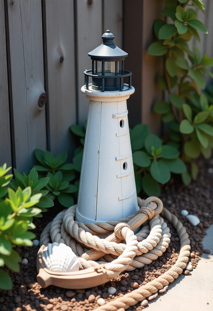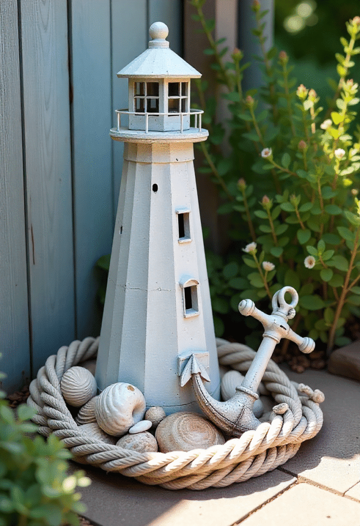 To make your lighthouse décor more realistic, add ropes, anchors, or life rings nearby. These small details can make your yard look like a cozy harbor. You can even paint them in white, red, or navy blue to match the lighthouse theme. A coiled rope border around your lighthouse display can give it a finished look. Hang a decorative anchor on your garden wall or fence for an authentic maritime vibe. These touches add depth and character to your overall coastal décor.