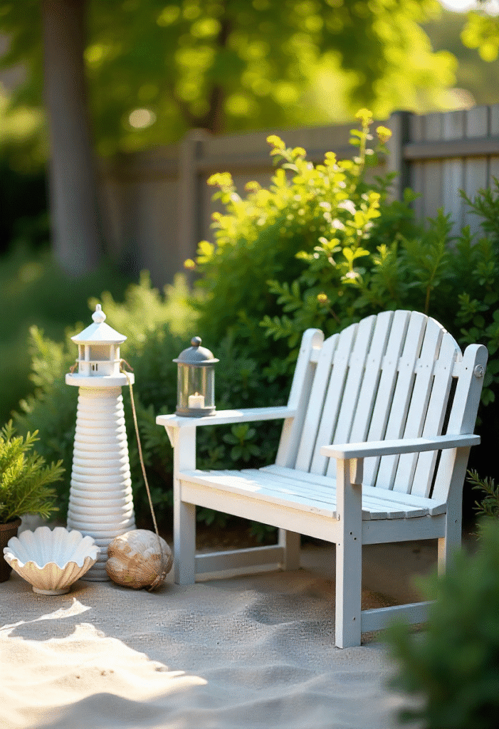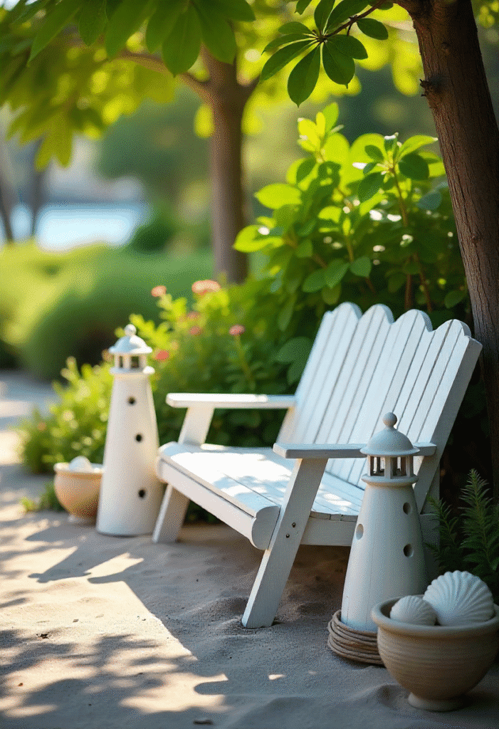 Create a peaceful lighthouse-themed sitting area where you can relax and enjoy your yard. Place a white or weathered wooden garden bench near your lighthouse display and decorate the area with small details like a rope knot cushion, seashell planters, and a lantern on the side. You can even paint a small lighthouse design on the bench’s backrest for a personal touch. Add a few smooth stones or sand around the base to complete the seaside look. This cozy corner becomes the perfect spot to read, sip coffee, or simply enjoy the gentle outdoor breeze while surrounded by coastal charm.