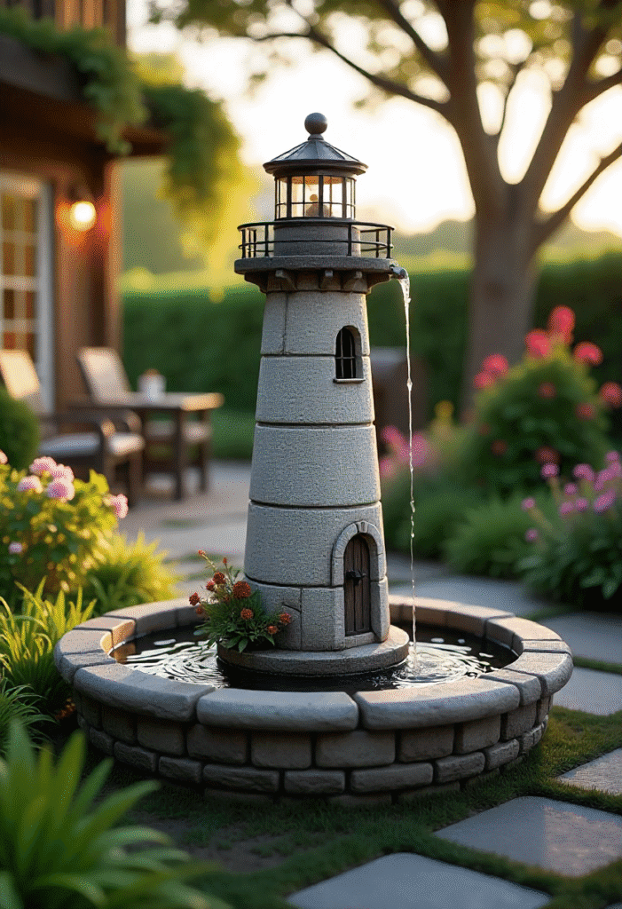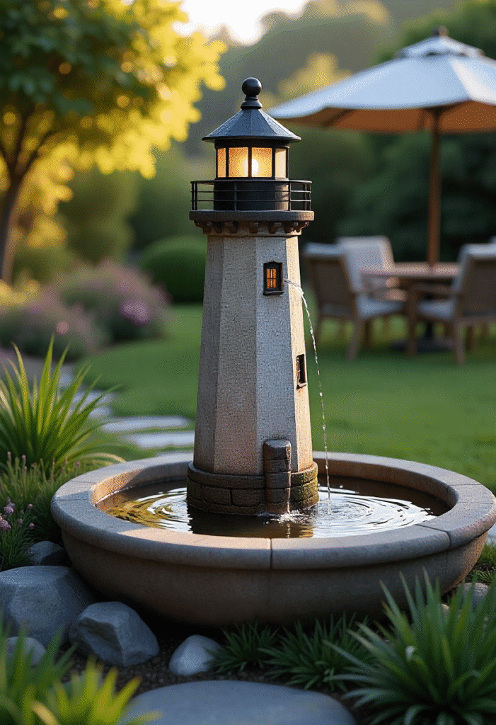 A lighthouse water fountain adds movement and sound to your space. The gentle sound of flowing water mixed with the seaside design makes your yard feel relaxing and fresh. You can place it near a seating area or patio for a calm, beach-like atmosphere. It also helps attract birds and butterflies, adding life and beauty to your outdoor space. Choose one with LED lighting for a lovely glow after dark. This idea blends sound, light, and design into one peaceful display.
