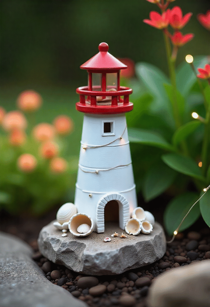 A small lighthouse sculpture can become the main attraction of your garden. Place it on a stone base and decorate around it with seashells, driftwood, and pebbles. This creates a mini coastal scene that feels warm and inviting. You can add small LED candles or fairy lights around it for a magical touch at night. The centerpiece can sit in a flower bed, patio corner, or even near your porch steps. It gives your yard a charming seaside personality that guests will always notice.