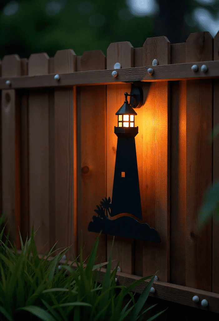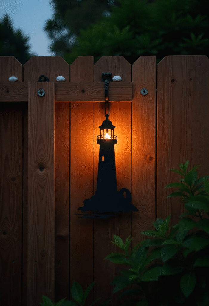 If your yard has a fence or garden wall, decorate it with a metal or wooden lighthouse silhouette. You can even find designs that light up in the dark. It’s simple, stylish, and adds a lovely evening glow. You can paint the silhouette in soft colors to blend with your wall. Add small shells or rope borders around it for extra detail. This idea saves space while still bringing a strong coastal mood to your garden.