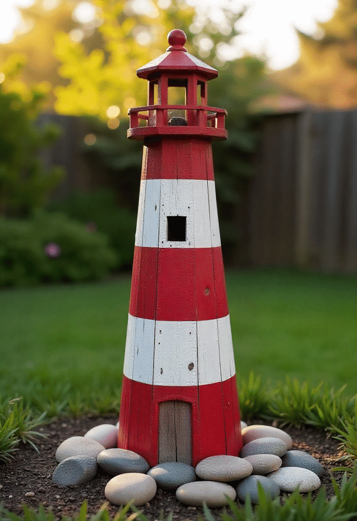 If you enjoy crafting, build your own lighthouse using driftwood, stones, or old wooden pieces. Paint it in classic white and red stripes. This gives your yard a rustic, handmade feel that’s both personal and creative. You can also glue on tiny windows or doors made of craft wood for extra detail. Driftwood adds texture and natural beauty, blending well with plants and stones. Every time you look at it, you’ll feel proud of the seaside touch you created yourself.