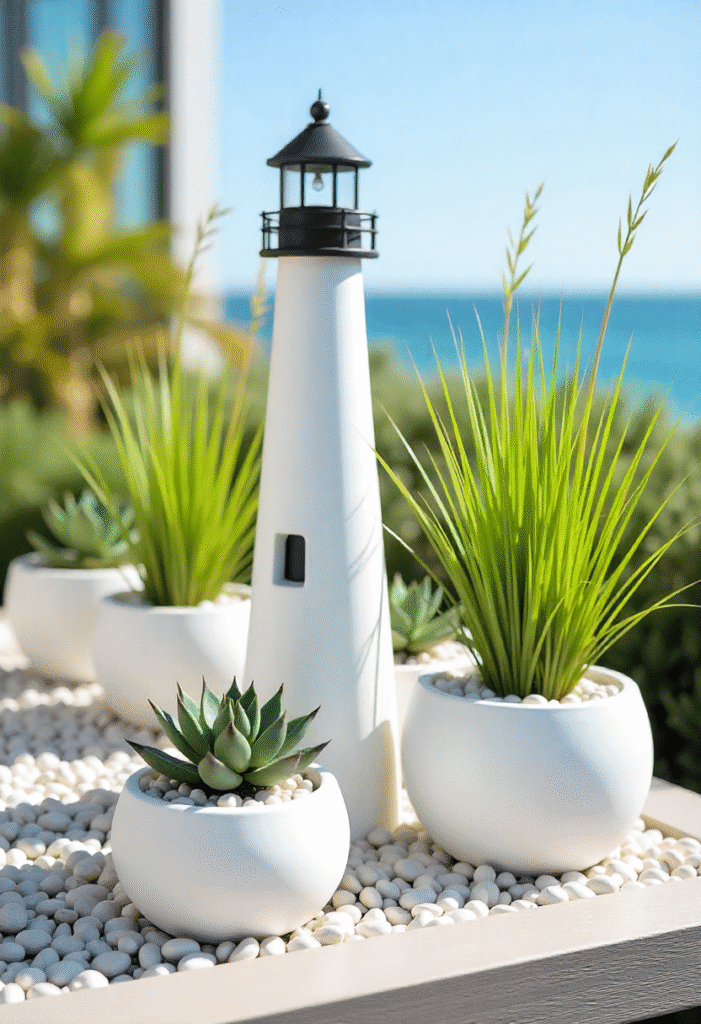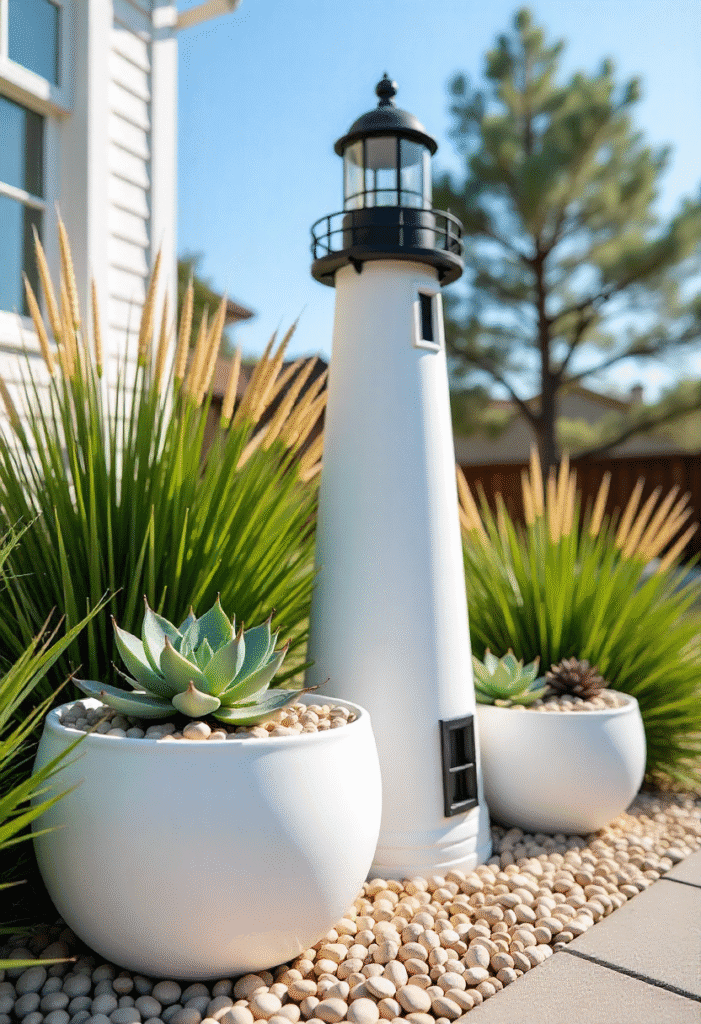 Surround your lighthouse décor with coastal plants. You can use white stones, beach sand, and planters filled with succulents or ornamental grass. It gives the space a fresh seaside look without needing too much maintenance. Add sea lavender, rosemary, or blue fescue to match the coastal palette. These plants thrive in sunny areas and create a natural harmony around your décor. The blend of green, white, and blue tones will make your yard feel calm and refreshing.