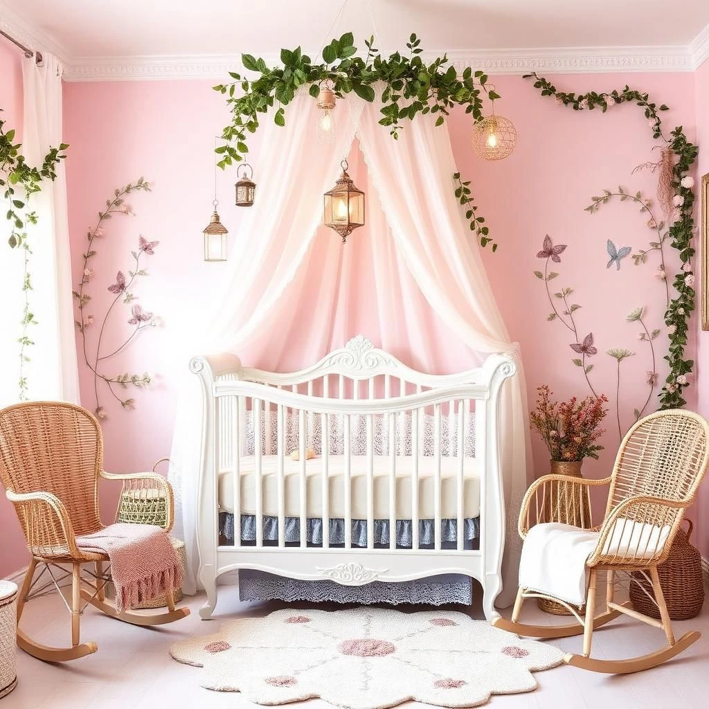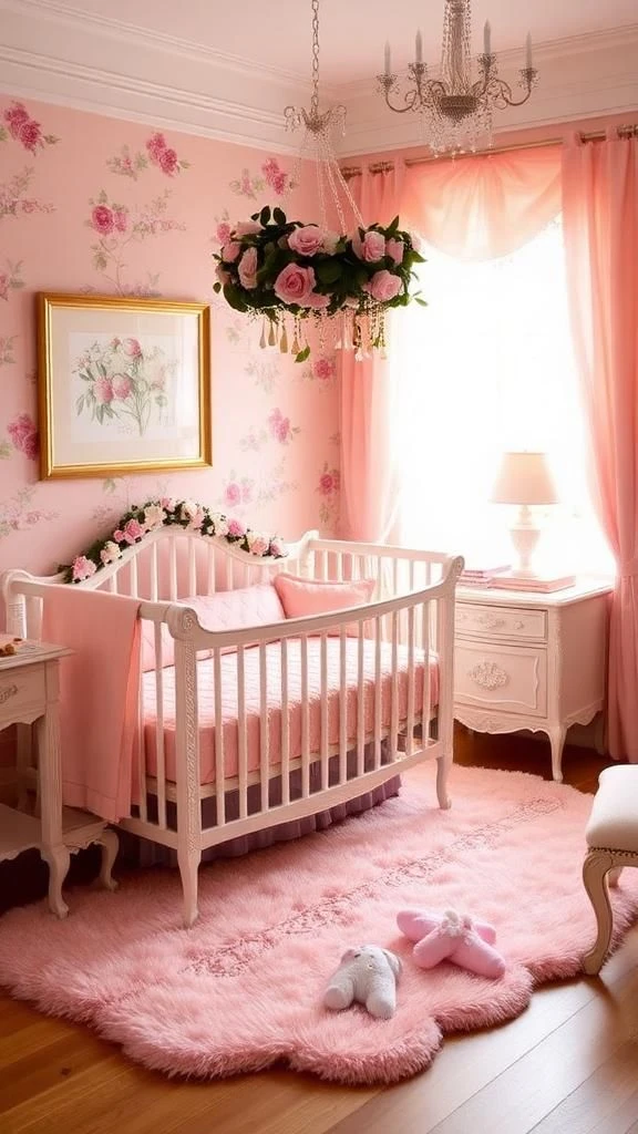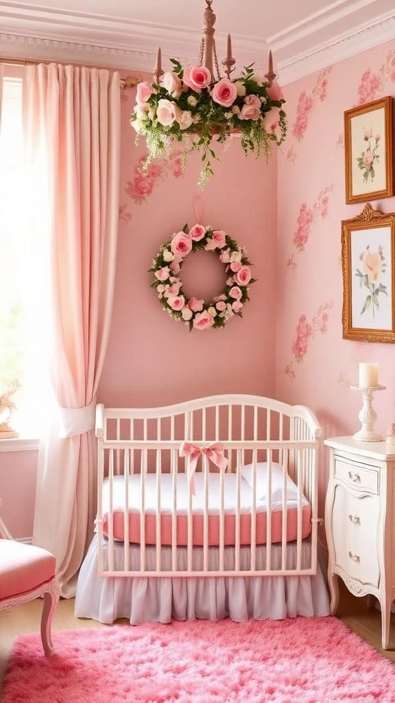 Rose-patterned wallpaper or framed prints cover the main wall. Furniture includes curved legs and spindle details, painted in soft ivory. A floral wreath hangs above the crib. Floor textures come from layered rugs in pale pink. Brass handles and mirrors add shine without distraction. This room draws inspiration from classic garden rooms.