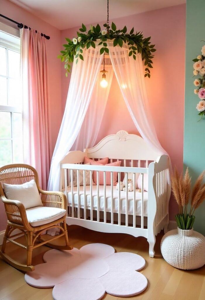 This layout mixes pastel walls with delicate green textures. A white crib is tucked beneath a hanging botanical canopy. Light streams through sheer curtains beside dried flower bunches. Wall space includes soft floral murals and thin wooden shelves. A flower-shaped rug softens the floor area. The room balances playful details with careful restraint.