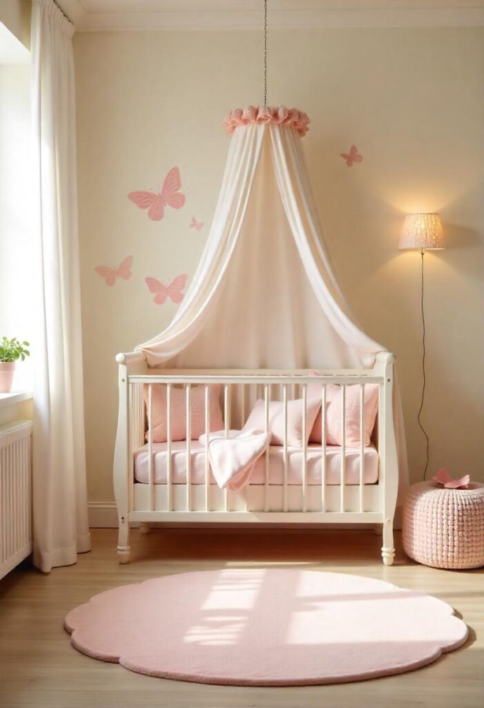 Walls are finished in muted yellows and pinks with painted butterflies in soft flight. A canopy with butterfly shapes floats above a light pink crib. Nearby, shelving includes butterfly-themed books and keepsakes. Lighting features soft edges and warm bulbs. Furniture stays low and rounded. The rug repeats the butterfly motif in a pale pattern underfoot.