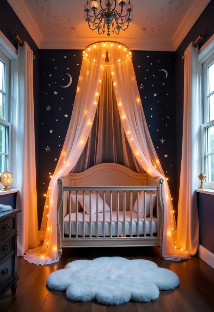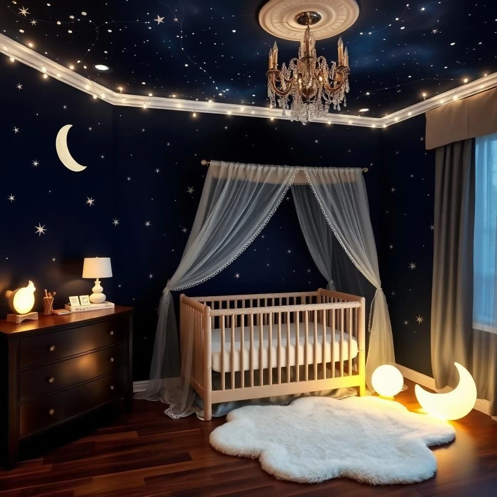 The walls are painted in deep navy, scattered with stars and a painted crescent moon. A soft velvet crib sits beneath a sheer canopy with silver threads. Lighting includes soft fairy lights and a silver chandelier overhead. A round rug shaped like a cloud adds volume near the crib. Furniture is dark-toned wood with subtle lines. The overall atmosphere feels like a quiet night under the sky.