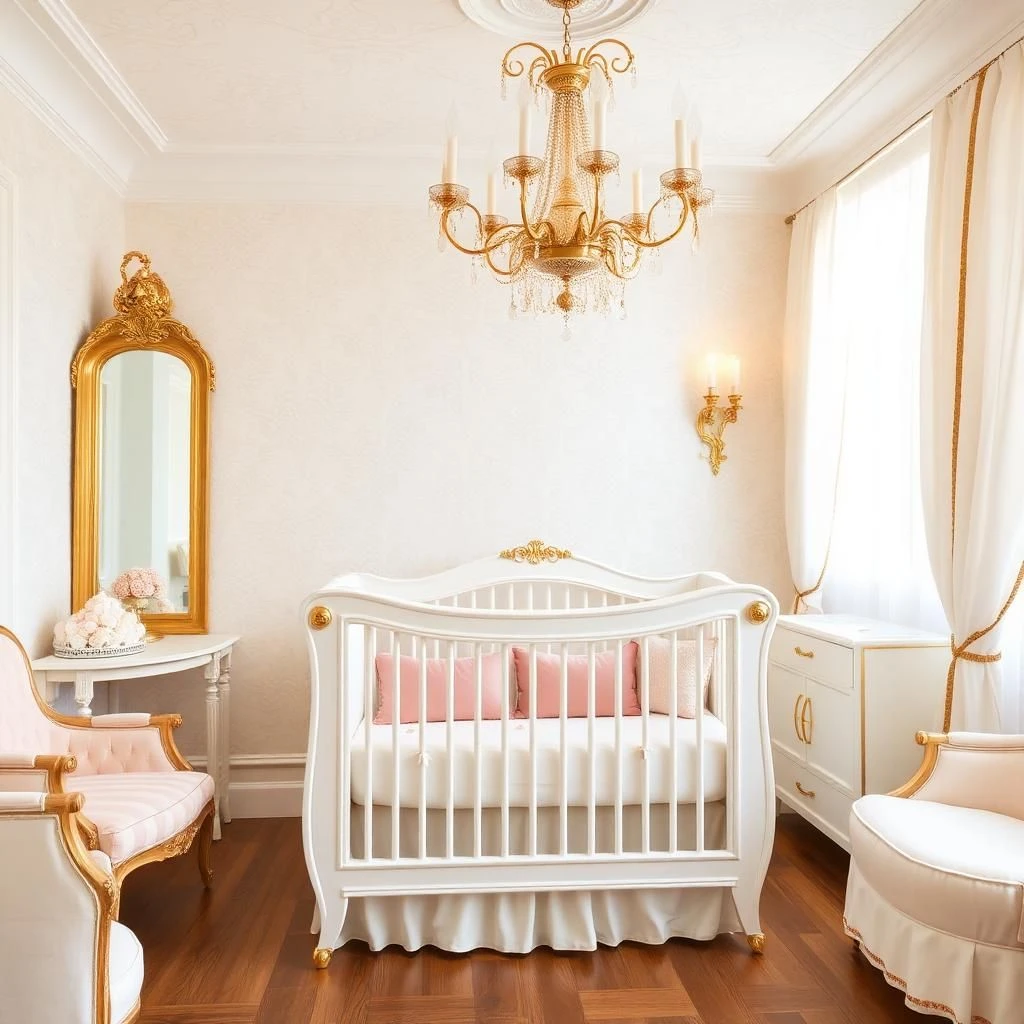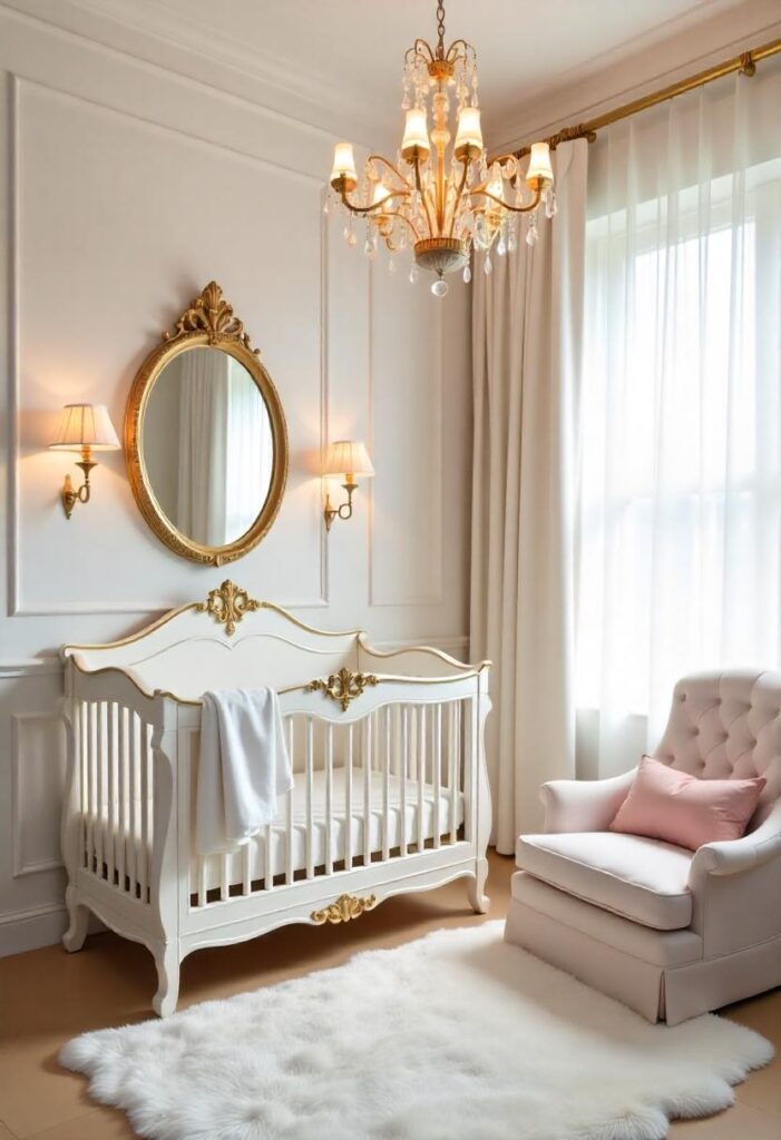 Pearl-toned wallpaper covers the walls with a soft, luminous texture. The crib features gold detailing and pale blush bedding. A chandelier hangs above a light-colored floral rug. Gold-framed mirrors reflect natural daylight onto soft curtains. Storage is minimal and integrated into painted cabinetry. Every piece appears selected with a sense of refinement.