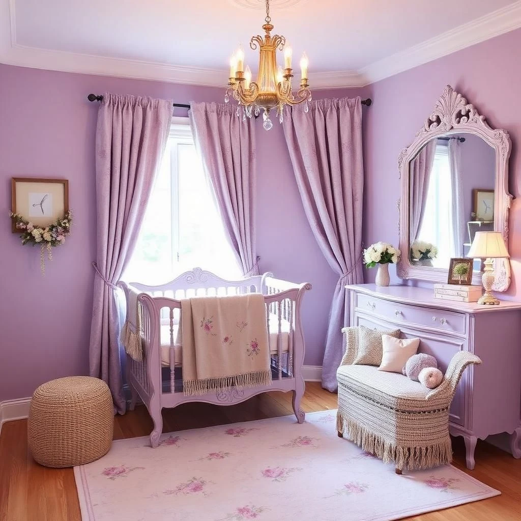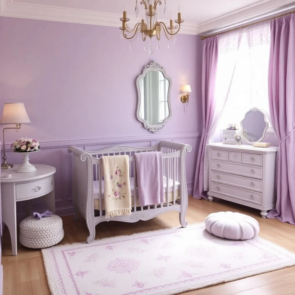 Lavender walls bring gentle color to the space without overpowering it. A crib painted in a pale gray-lavender tone rests near antique-style drawers. Curtain fabric includes embroidered floral patterns in muted tones. The lighting remains diffused, relying on wall sconces and standing lamps. A pale rug with a faded botanical design anchors the furniture. The mood suits evening quiet and early mornings.