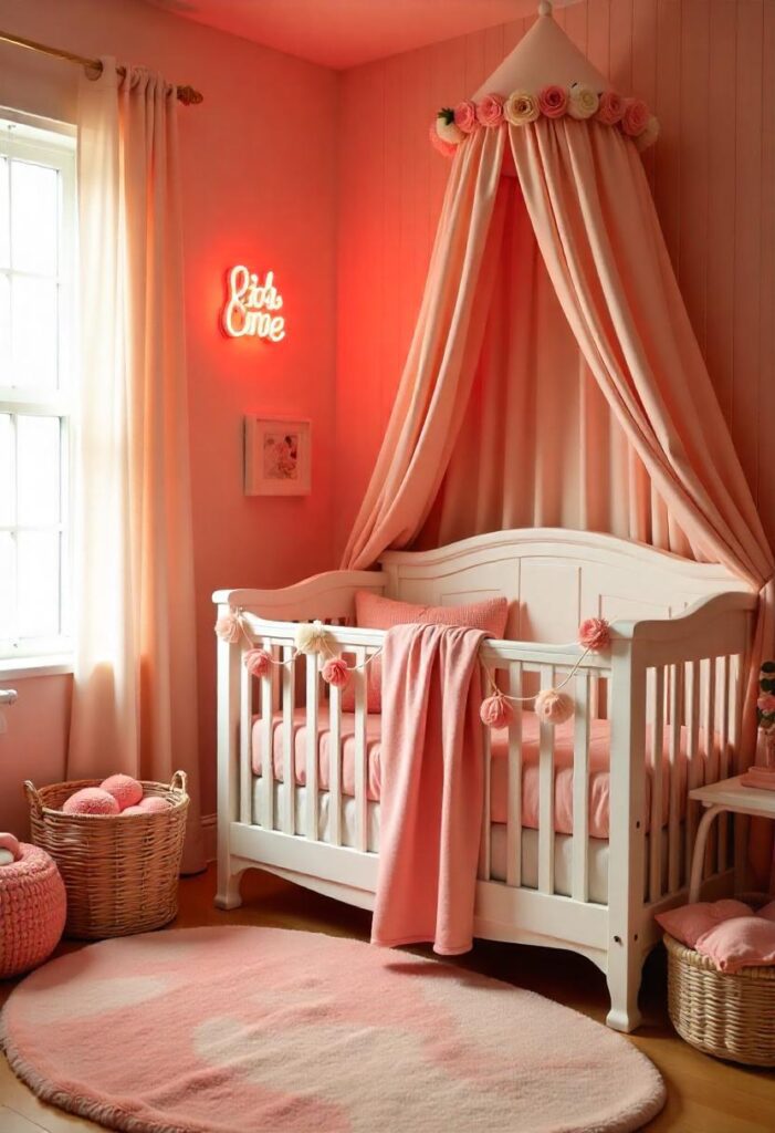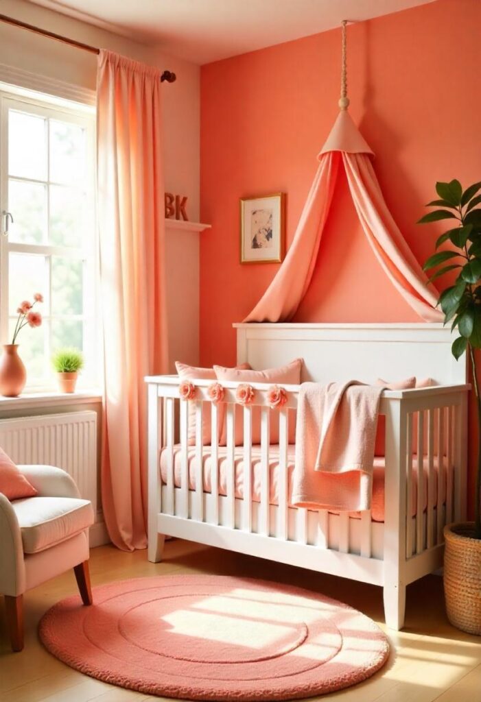 Walls are painted in soft peach with coral details in the bedding and cushions. A light wood crib rests against a horizontal wood plank backdrop. The rug draws from soft creams and peach tones. Above the crib, a gentle garland introduces texture. Curtains have a light pink tint and reach the floor. The design works well in rooms with good natural light.