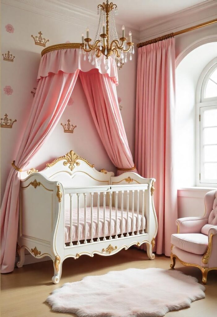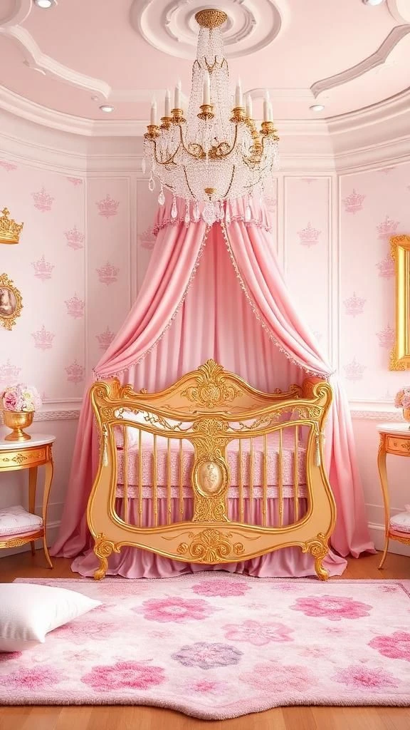 This room uses classic pinks paired with bright white and touches of gold. A tall crib with gold accents sits beneath a crown-style canopy. Crystal lighting fixtures provide brightness from above. The wallpaper includes pale floral patterns in vertical arrangements. Velvet throws and framed artwork line the corners. The layout highlights formality with gentle details.