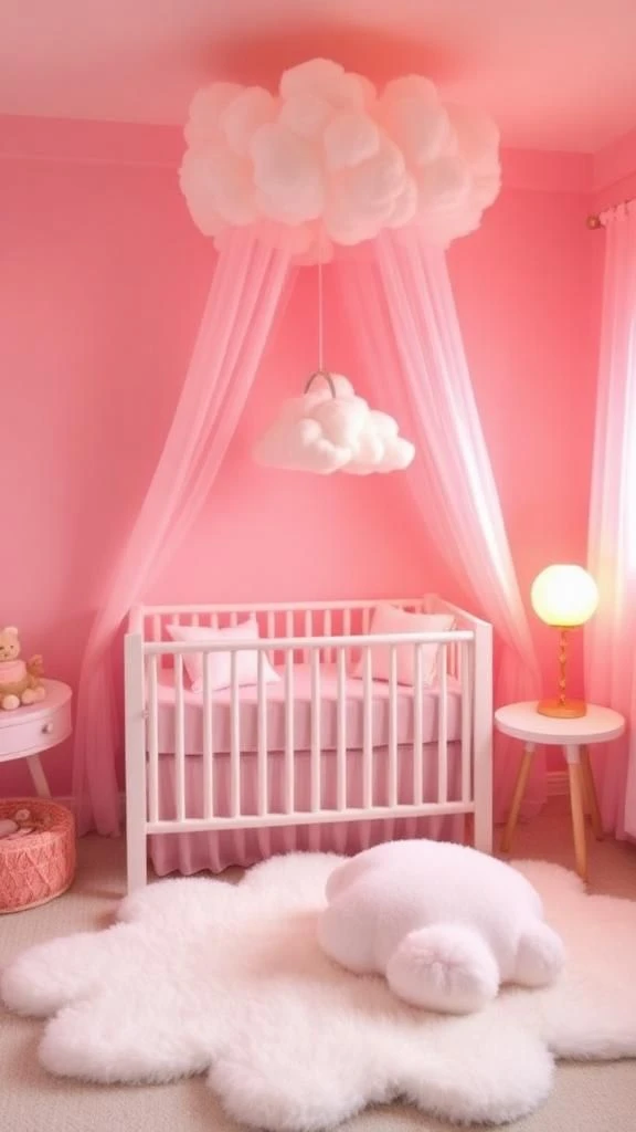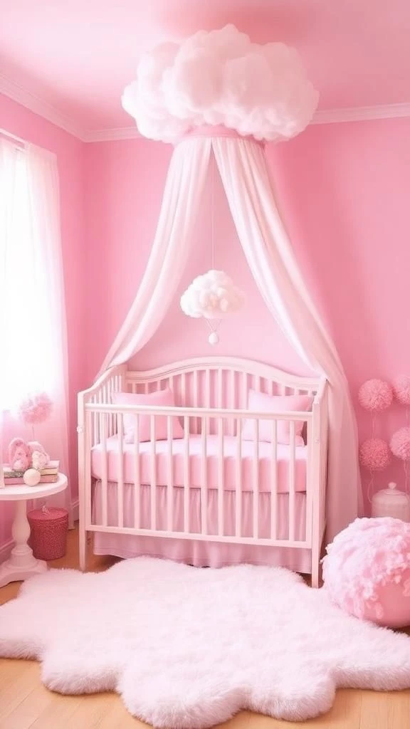 This layout favors soft pastel pinks throughout the ceiling and walls. The crib includes plush bedding and a candy-shaped pillow set. A mobile with cloud shapes hangs above. Floor space features a high-pile white rug in an abstract curve. Decorative items are limited but themed around soft textures. This room suits a lighter design approach with a bit of imagination.