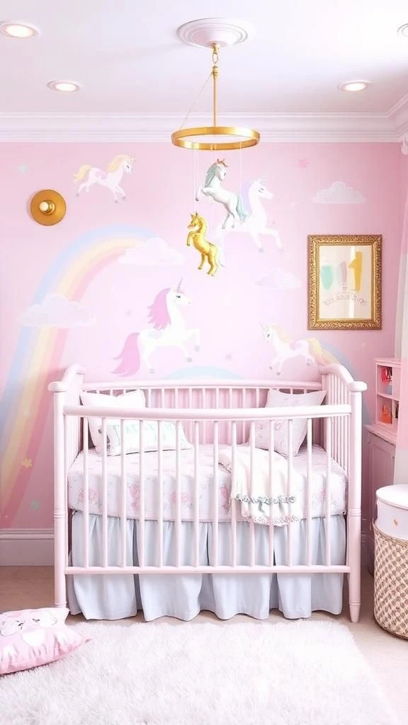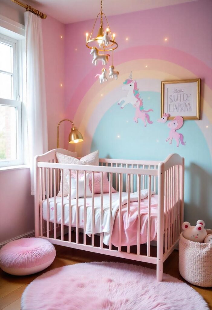 A feature wall includes mural work of unicorns and pastel rainbows. The crib remains white but includes themed bedding and soft metallic touches. A hanging mobile with star shapes and soft orbs hangs near the wall. Light furniture with slim legs keeps the space feeling airy. A mint-green rug and matching pillow complete the palette. The design plays with fantasy without clutter.