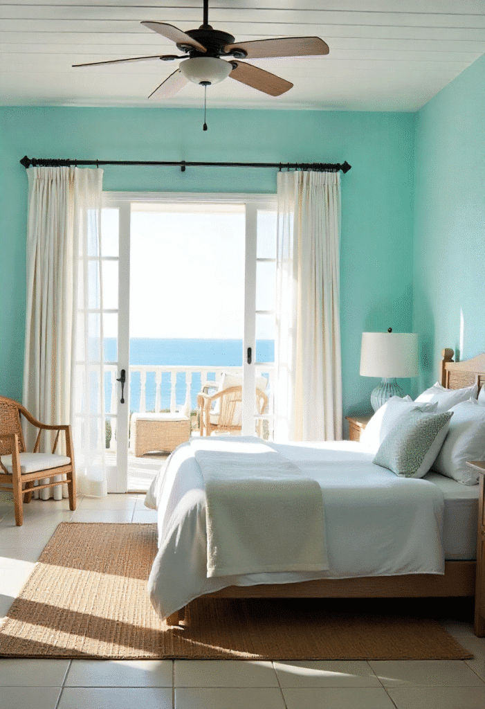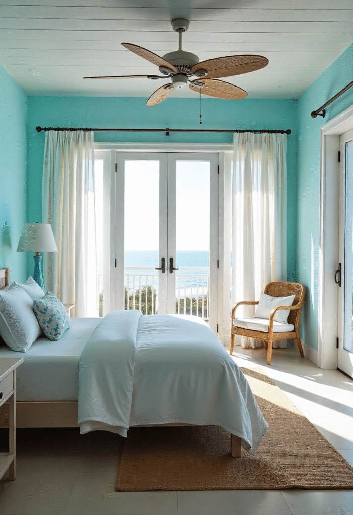 Light pours through sheer curtains onto textured blue plaster walls. The furniture is bleached oak, with cane doors that add coastal warmth. A jute rug softens the floor, and the faint scent of salt air lingers from an open balcony. Blue lamps and a driftwood ceiling fan tie the palette together. Potted palms stand near the window, creating a seamless link between the indoors and the sea. Everything feels airy, crisp, and touched by the rhythm of the waves.