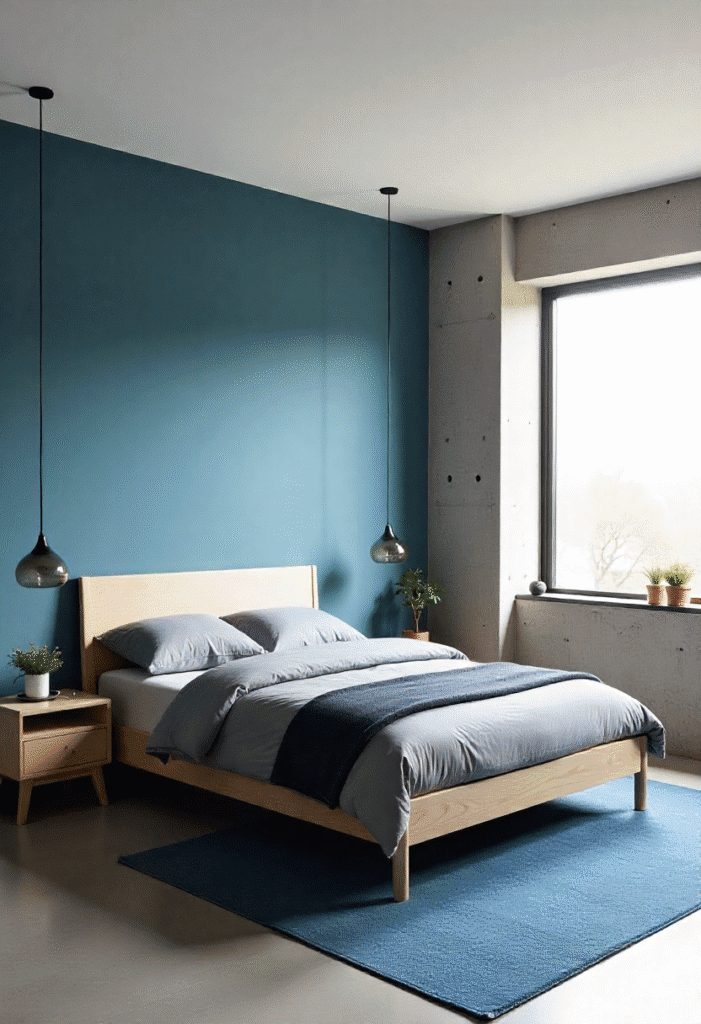 This space pairs the softness of powder blue with the edge of concrete. A single gray accent wall adds modern grit, while oak furniture and smoky glass lighting bring warmth. The bed sits centered on a blue wool rug, simple but perfectly placed. The combination feels balanced and personal, both strong and delicate. It is the kind of bedroom that invites quiet reflection after a long day, where textures speak more than color ever could.