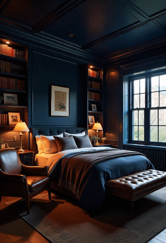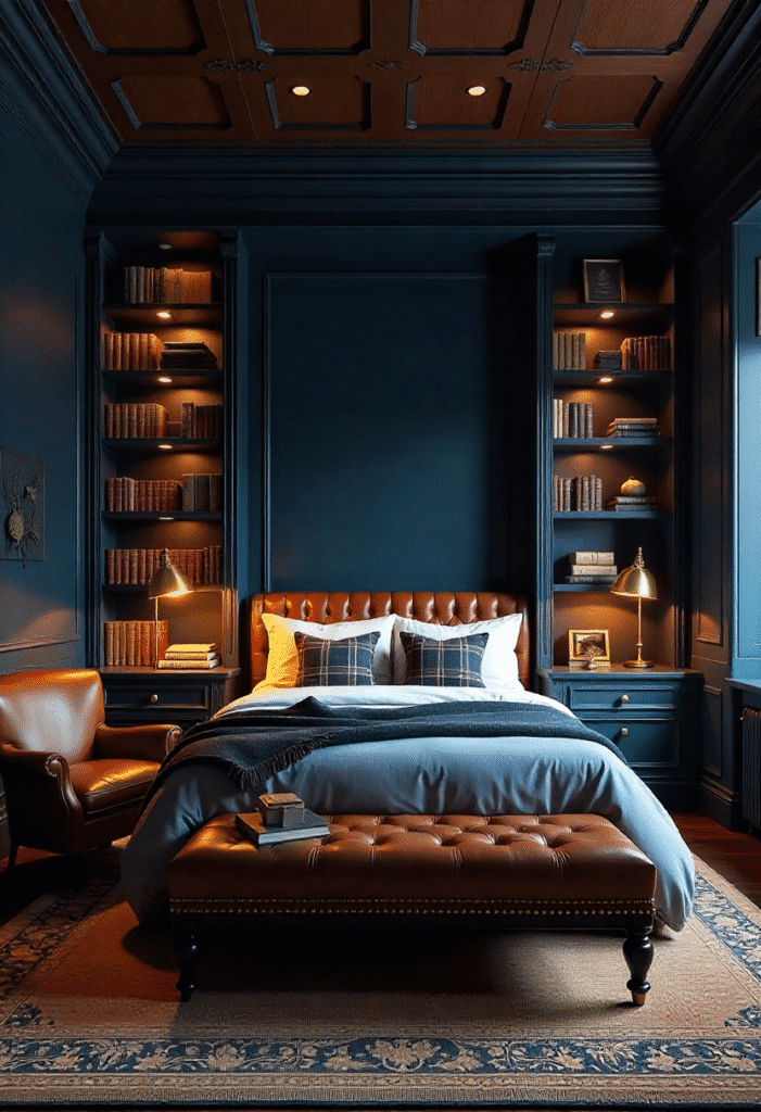 A navy bedroom with built-in bookshelves turns reading into a nightly ritual. The shelves wrap around the bed like a protective frame, their warm LED lighting pooling softly onto old hardcovers. A coffered wooden ceiling painted deep blue completes the scene. A leather armchair rests under a reading lamp beside the window. The scent of paper and polished wood fills the air, making this room a sanctuary for dreamers and thinkers alike.