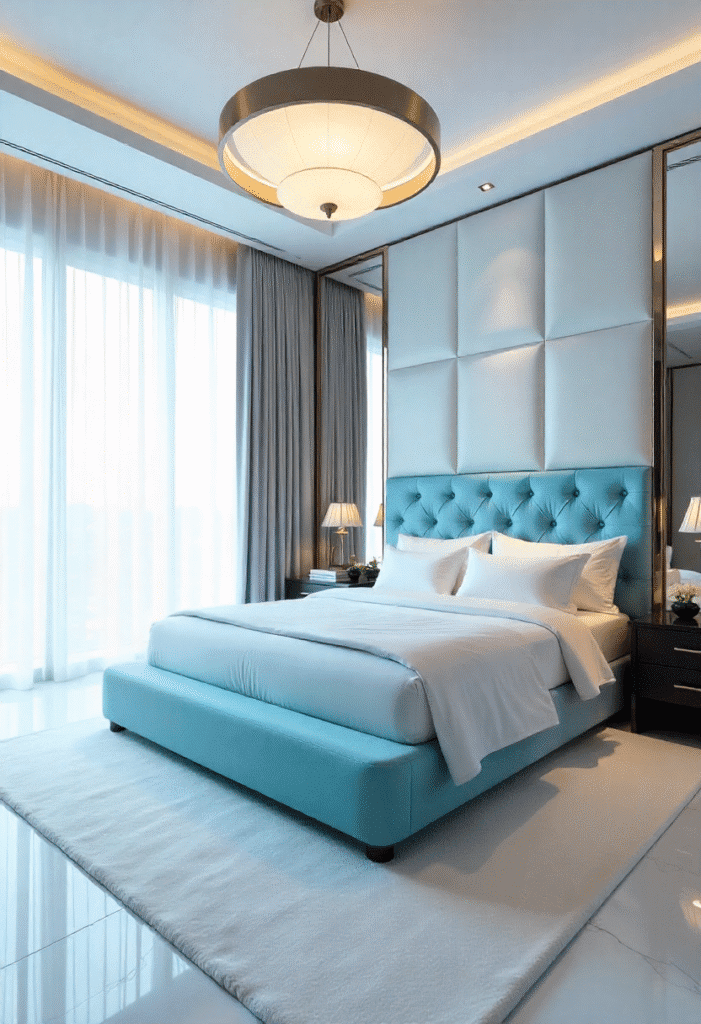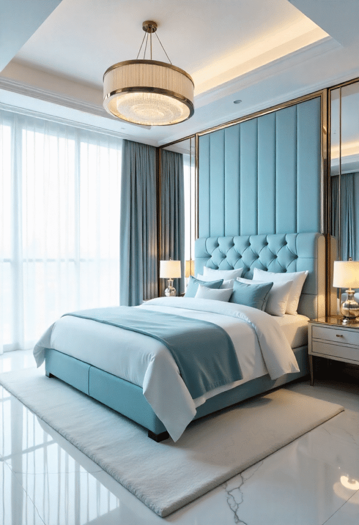 Here blue takes a sophisticated turn. Pale ice-blue velvet frames the bed, while white marble floors reflect the circular glow of an LED chandelier. The headboard wall is padded in leather, making the room both plush and acoustically calm. Everything gleams softly, from chrome accents to mirrored wardrobes. A vase of white lilies on the bedside table adds a scent of quiet elegance. The space feels timeless, confident, and effortlessly graceful.
