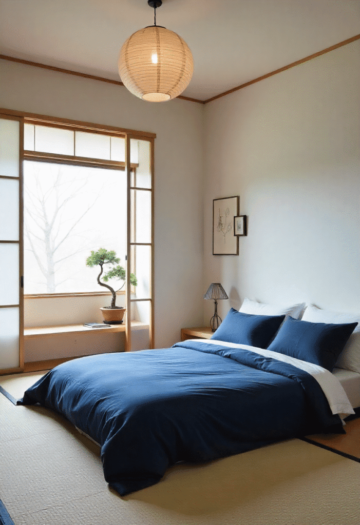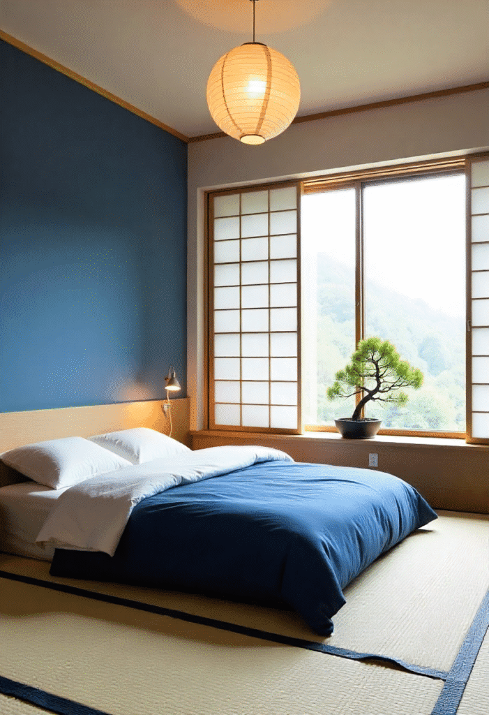 Here, simplicity feels spiritual. The room features white shoji screens, tatami-inspired flooring, and a futon set low to the ground. Indigo textiles bring balance to the soft whites and natural wood tones. A paper lantern above the bed casts a calm, diffused light that feels like moonlight caught in fabric. Every element is intentional, nothing excessive, only peaceful balance. It feels like a space where time slows and breathing deepens naturally.