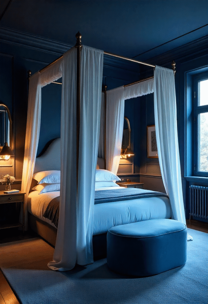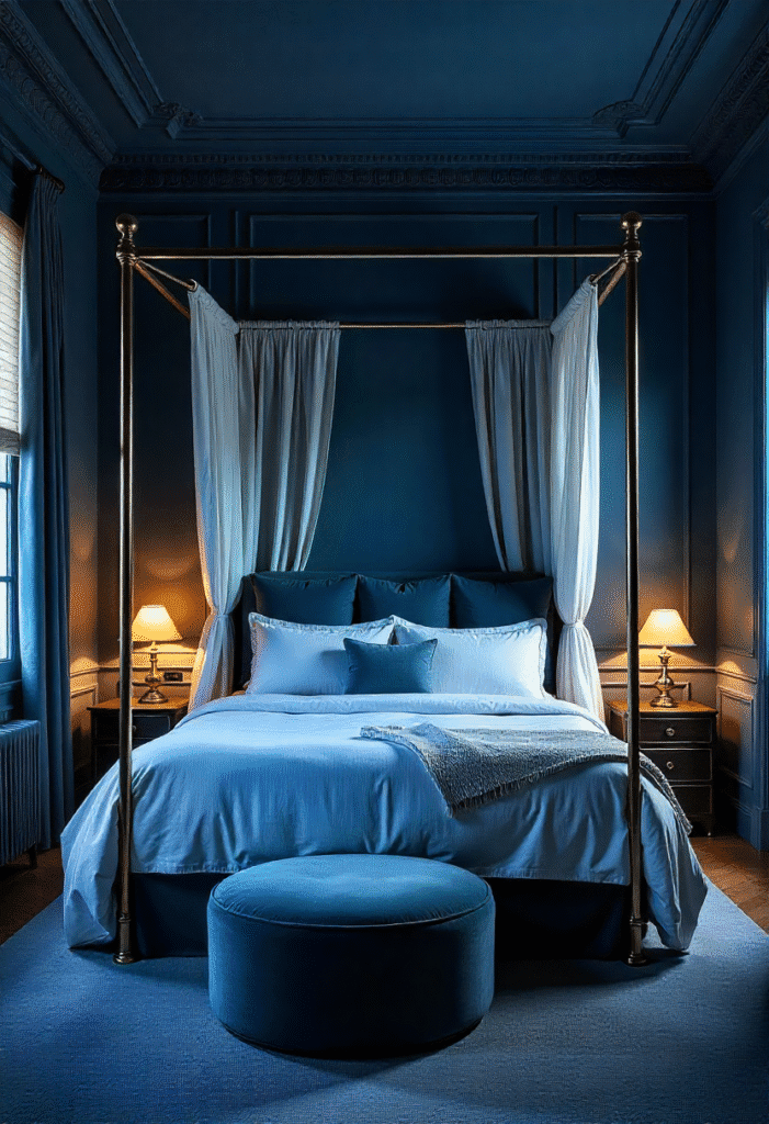For those who love a touch of drama, this bedroom becomes a cocoon of blue. The walls, ceiling, and trims share the same Prussian blue tone, wrapping the space in elegant depth. A sheer linen canopy hangs over the bed, diffusing golden light from brass sconces on either side. Velvet textures and rounded furniture give the room an almost cinematic glow. It feels intimate, secluded, and quietly grand, the kind of space where night feels endless.