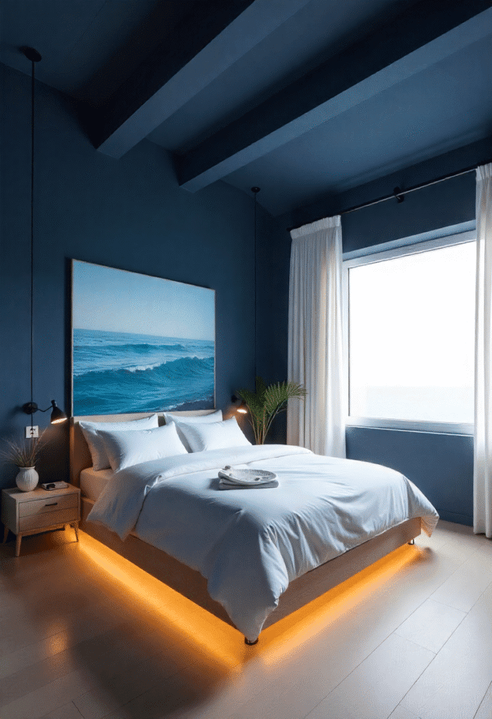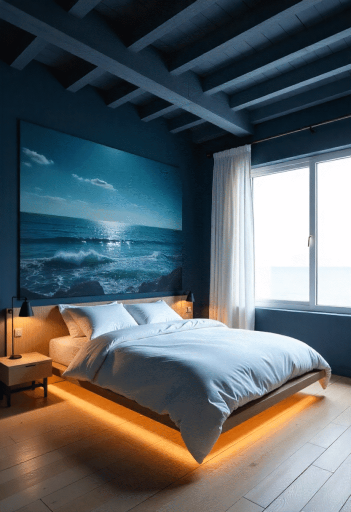 Imagine a room where the horizon meets the floor. The walls are a soft navy, while light wood planks create a pale base beneath a floating platform bed. The bed glows subtly from hidden LED strips underneath, and a panoramic ocean mural stretches behind the headboard. Gentle white curtains move with the breeze near wide windows. A low bookshelf rests along one wall, and the air carries a faint scent of salt. The whole room feels peaceful, as though it belongs to someone who wakes up with the tide.