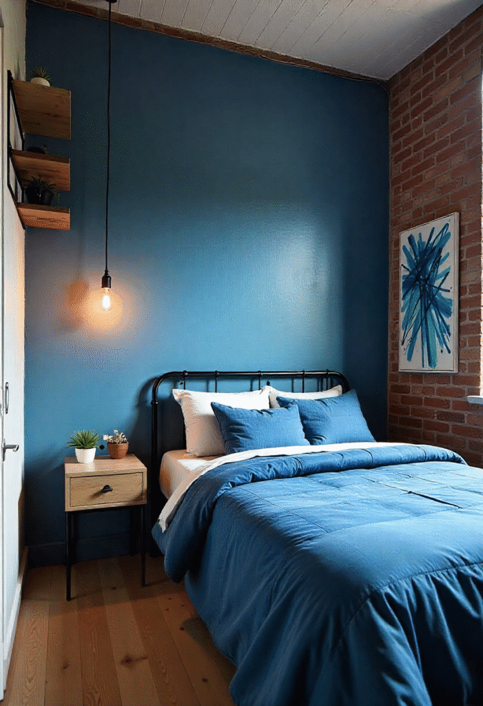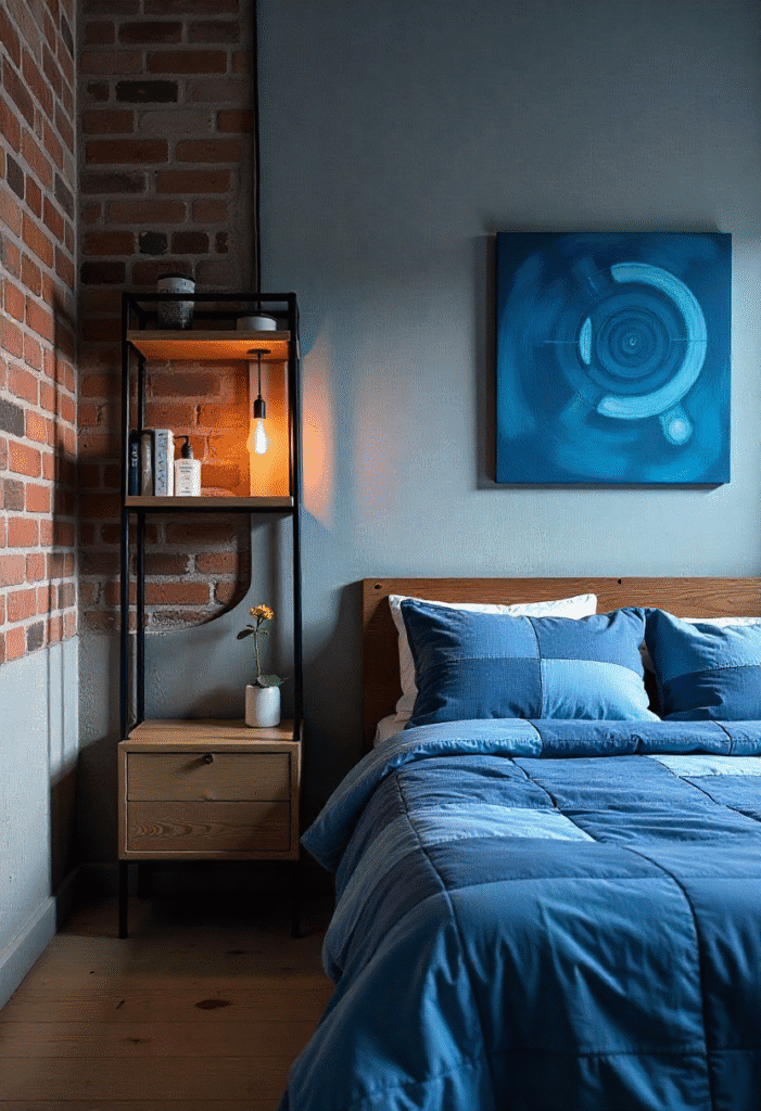 Think of this as a creative city retreat. The walls are washed in a denim texture, slightly worn and rich with tone. Reclaimed wood tables flank a bed dressed in patchwork indigo bedding. Industrial black shelving and an Edison pendant light complete the look. Abstract graffiti artwork in muted blue sits against a brick corner. It is a space full of character, alive with individuality, and perfect for late nights filled with music and thought.