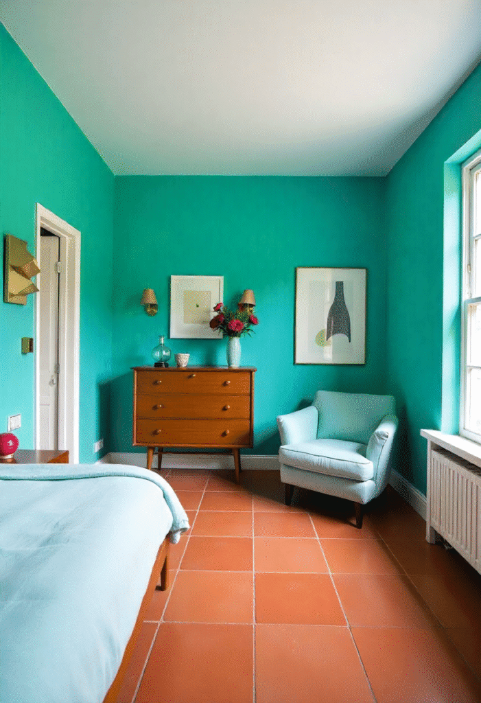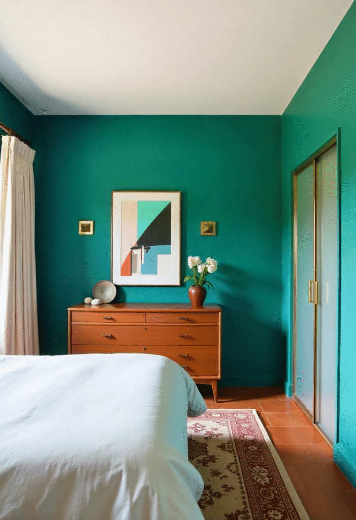 Teal gives this bedroom an artistic pulse. The walls shine with color, while terracotta floor tiles ground the space with warmth. Framed abstract artworks line the wall symmetrically, and glass-door wardrobes display neatly arranged clothes like a personal gallery. Lighting comes from geometric sconces in bronze tones, casting shapes across the ceiling. The mix of color and composition turns this space into something sculptural and imaginative.