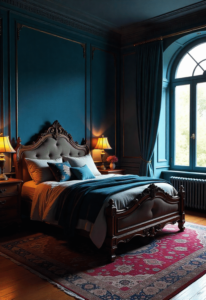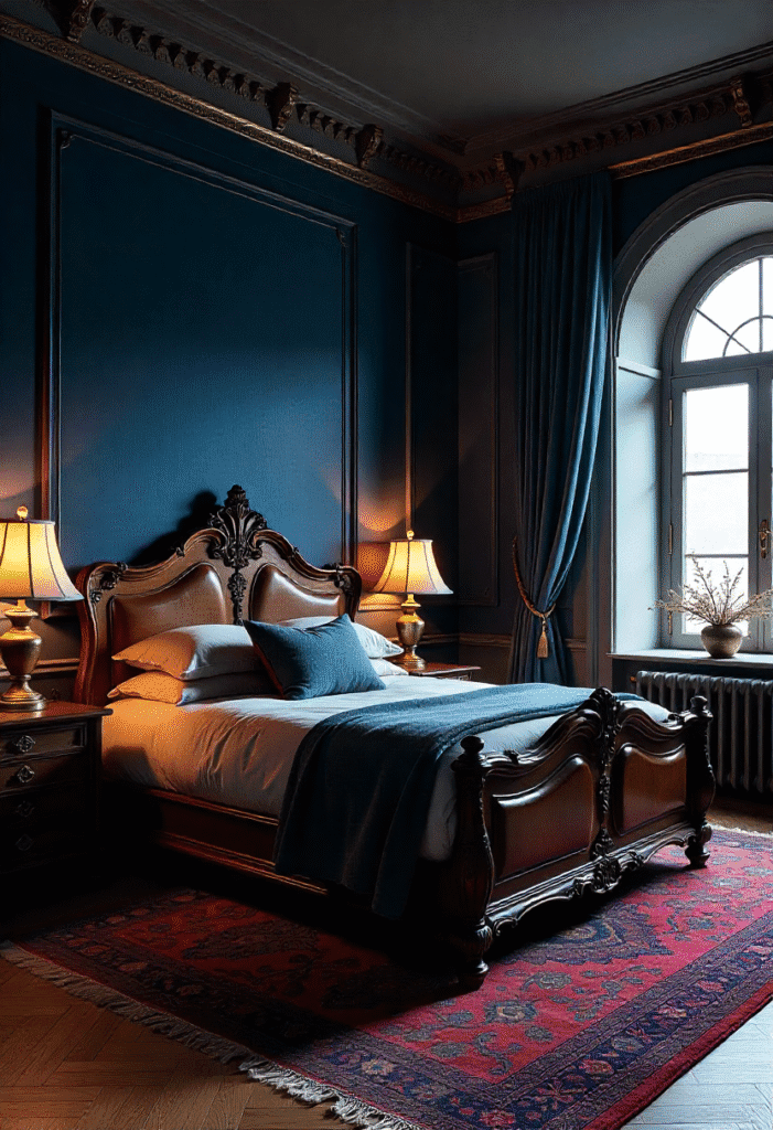 This final design embraces nostalgia. Navy velvet wallpaper shimmers under golden light, while antique furniture adds depth and texture. Persian rugs bring warmth to the cool palette, layering reds and blues like a memory woven into fabric. Heavy curtains frame an arched window, and brass lamps scatter a quiet glow. A carved mirror above the dresser catches fragments of light in the late afternoon. It feels cinematic, romantic, and filled with quiet beauty.