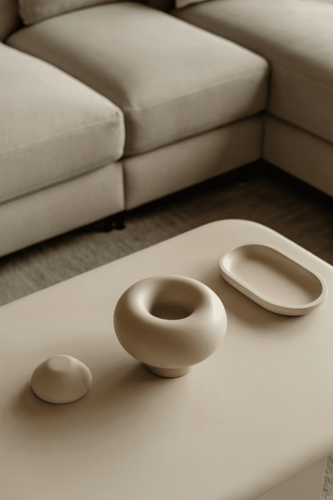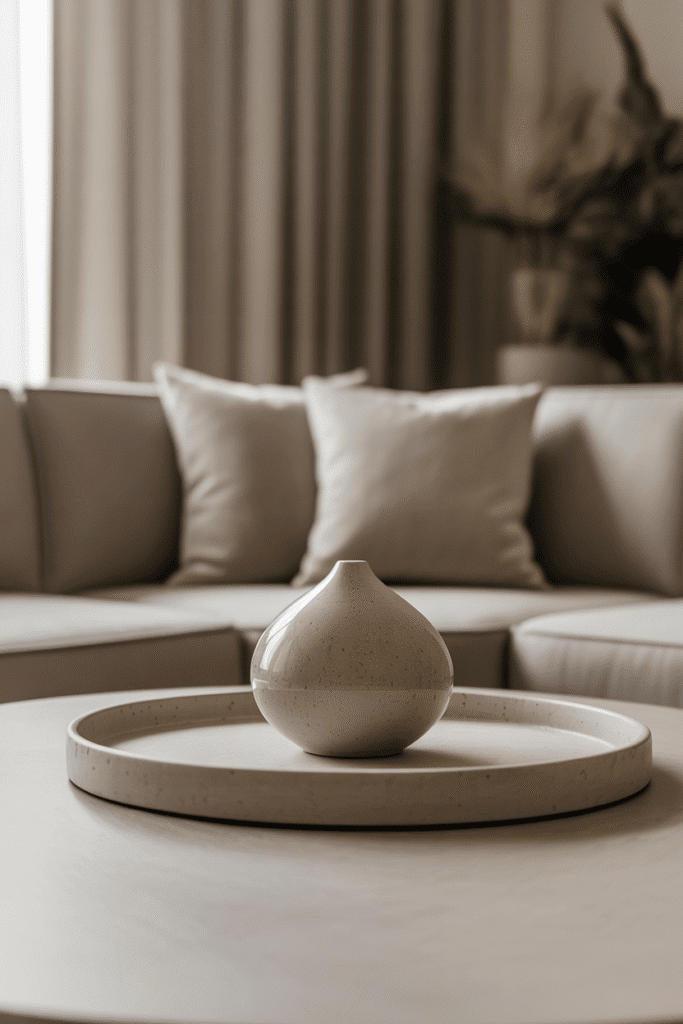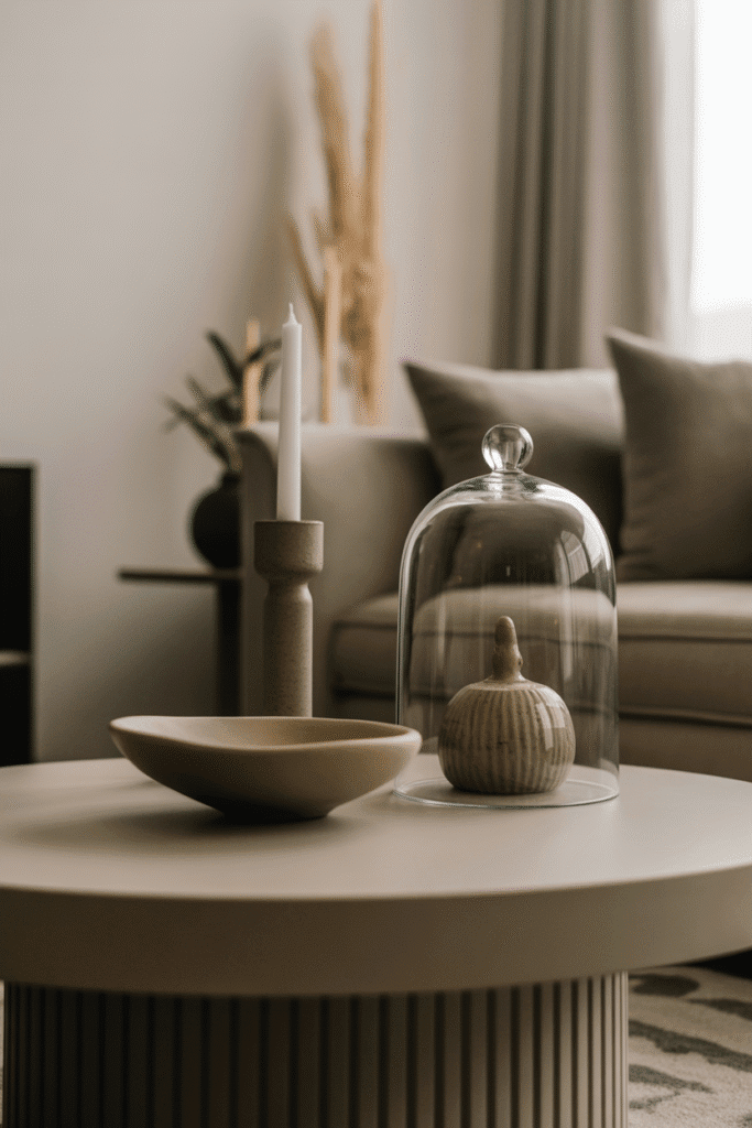 If your living room has a neutral base, use the table to introduce a pop of color. Metallic tones such as brass or silver work well with matte finishes for extra depth. Using repetition of the same two tones across objects strengthens harmony.