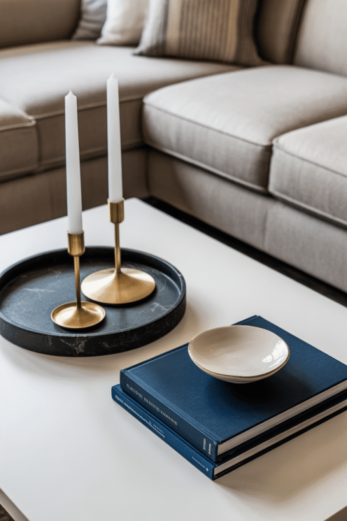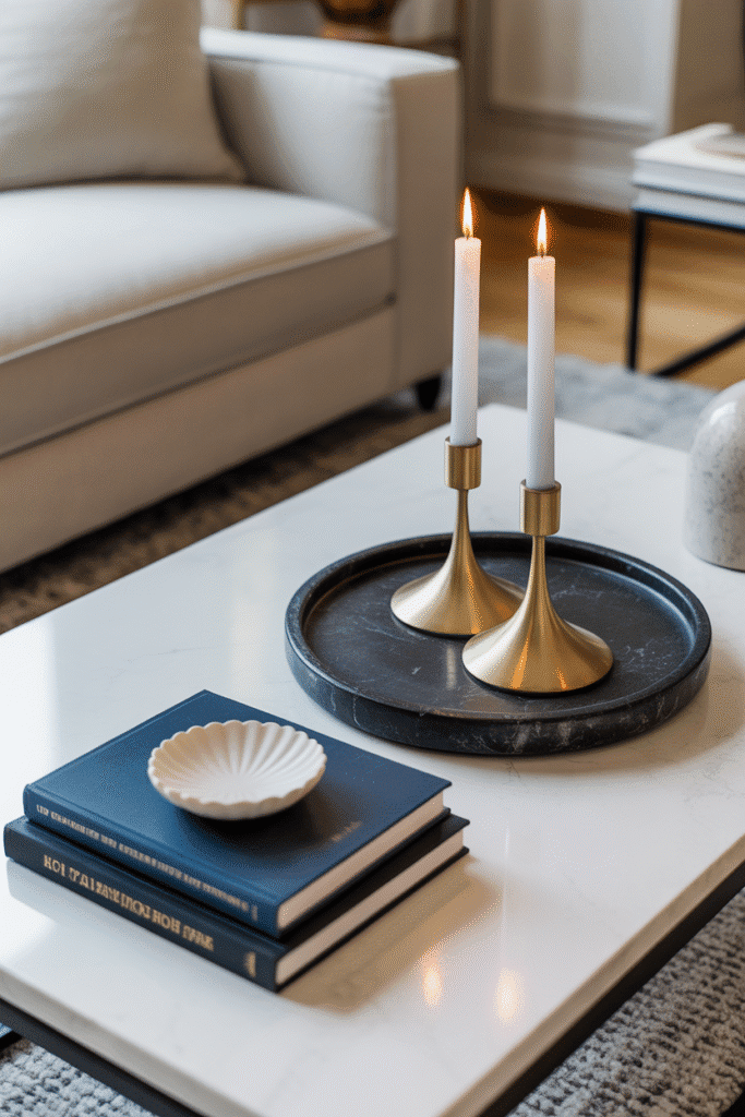 Strong color pairings anchor a table without overwhelming the room. Select two dominant tones already present in your décor. A black stone tray paired with brass candle holders or a white ceramic dish balanced by deep navy books are striking examples. The pairing feels intentional, keeping the table bold yet controlled.