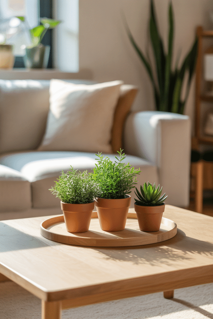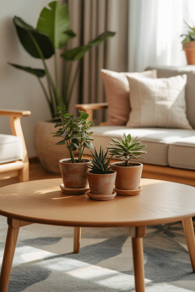 Instead of relying on one large plant, try a cluster of three small potted greens. Use uniform containers for cohesion, but stagger their placement for movement. Succulents or small ferns bring a fresh look while staying low maintenance. This approach suits coffee tables in both minimalist and cozy interiors.