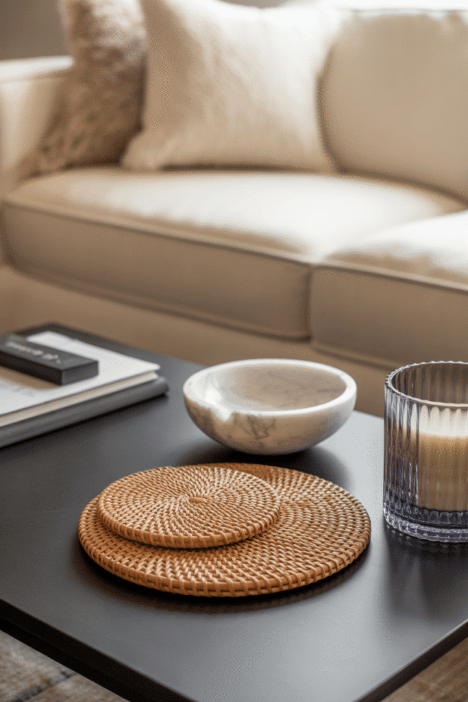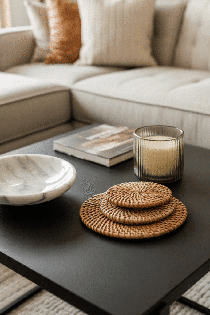 Texture is as important as color. Combine matte ceramics, glossy glass, woven baskets, and polished stone in a single layout. A rattan coaster set beside a marble bowl and glass candle holder creates depth, even with neutral colors. This idea is especially effective for plain wooden tables that need added dimension.