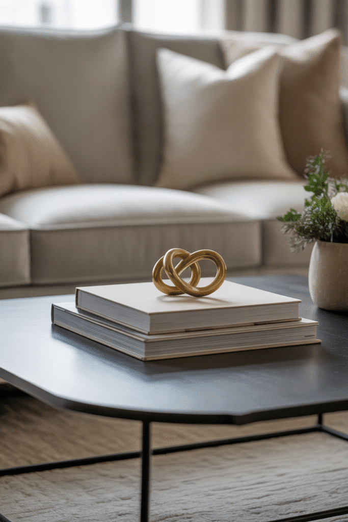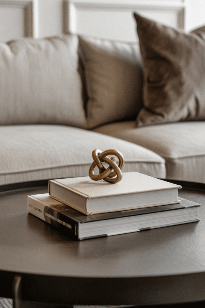 A stack of books is a coffee table classic, but topping it with a distinctive piece gives the setup presence. Place two or three hardcovers, then add a carved stone ornament, a brass knot, or a small sculpture on top. The books provide structure while the object adds personality.