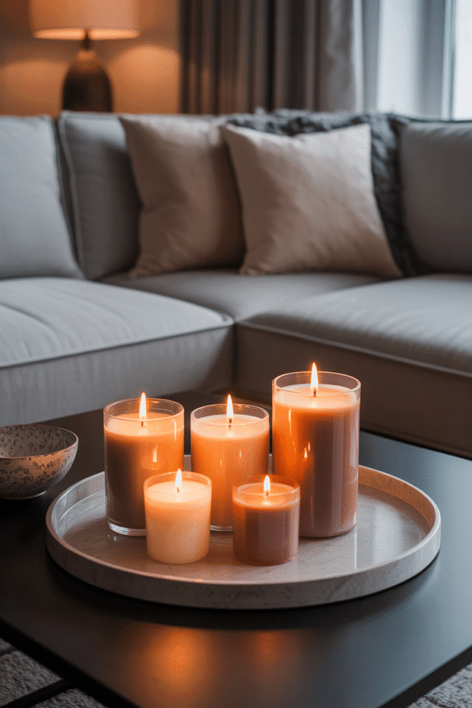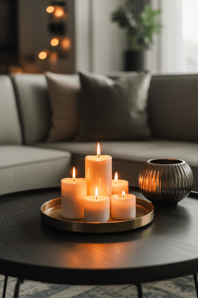 Candles bring warmth, and when grouped, they create intimacy. Use three to five candles of varying shapes but in the same color family. Cluster them on one side of the table, and balance the opposite side with a bowl or tray. This setup is perfect for relaxed evenings when atmosphere matters most.
