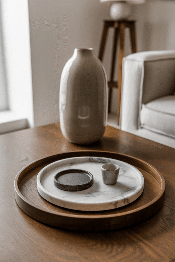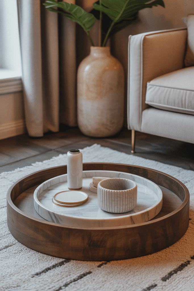 Using contrasting tray materials adds interest, such as marble inside wood or lacquer inside rattan. Keep at least one empty corner of the outer tray to avoid looking crowded. This setup works especially well on oversized coffee tables where zoning matters.