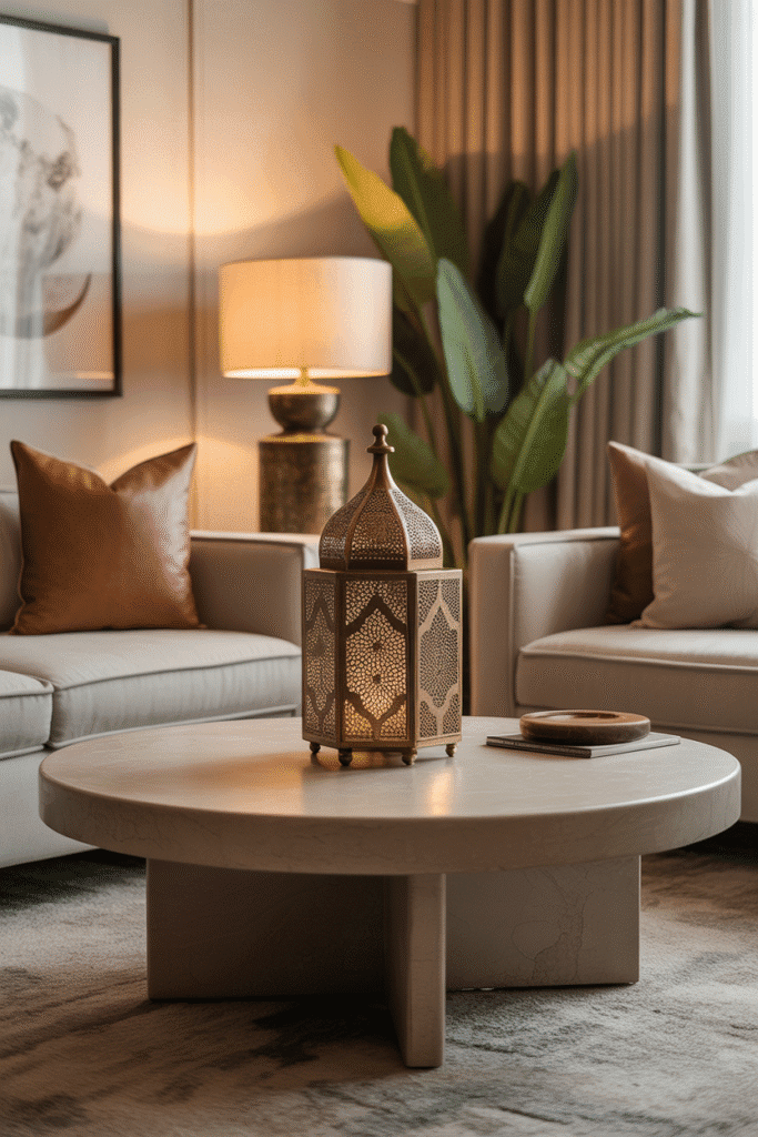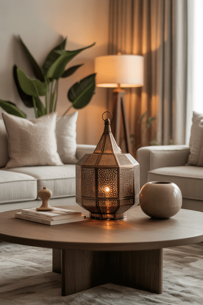 Let your coffee table tell a story. Anchor the layout with a travel inspired piece such as a Moroccan lantern, a Japanese tea bowl, or a carved African beadwork item. Surround it with understated modern accents to let it stand out. This design adds personality and makes the table feel both curated and meaningful.