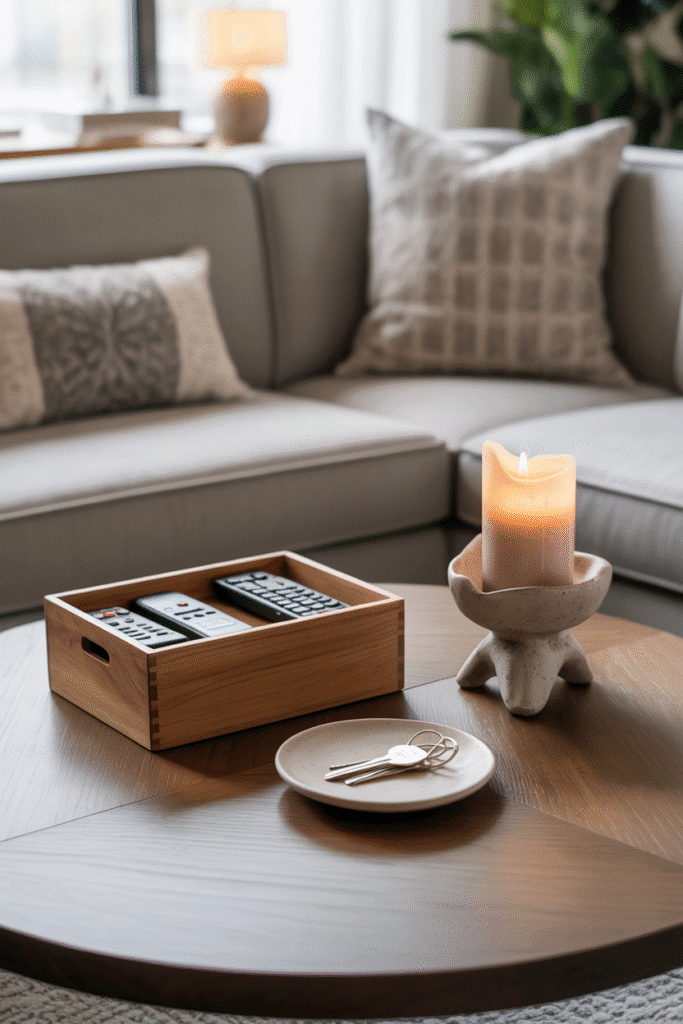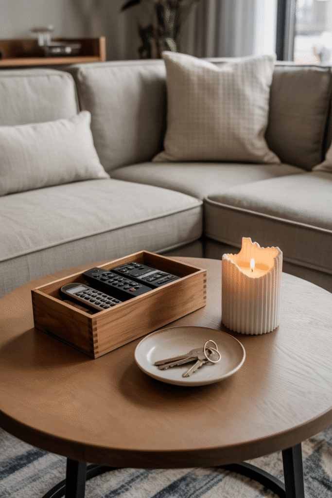 A coffee table in daily use can still look refined. Use a lidded box for remotes, a shallow dish for keys, and one decorative piece such as a sculptural candle. By keeping surfaces functional but intentional, the table stays organized without sacrificing charm. This approach works especially well in family living rooms.