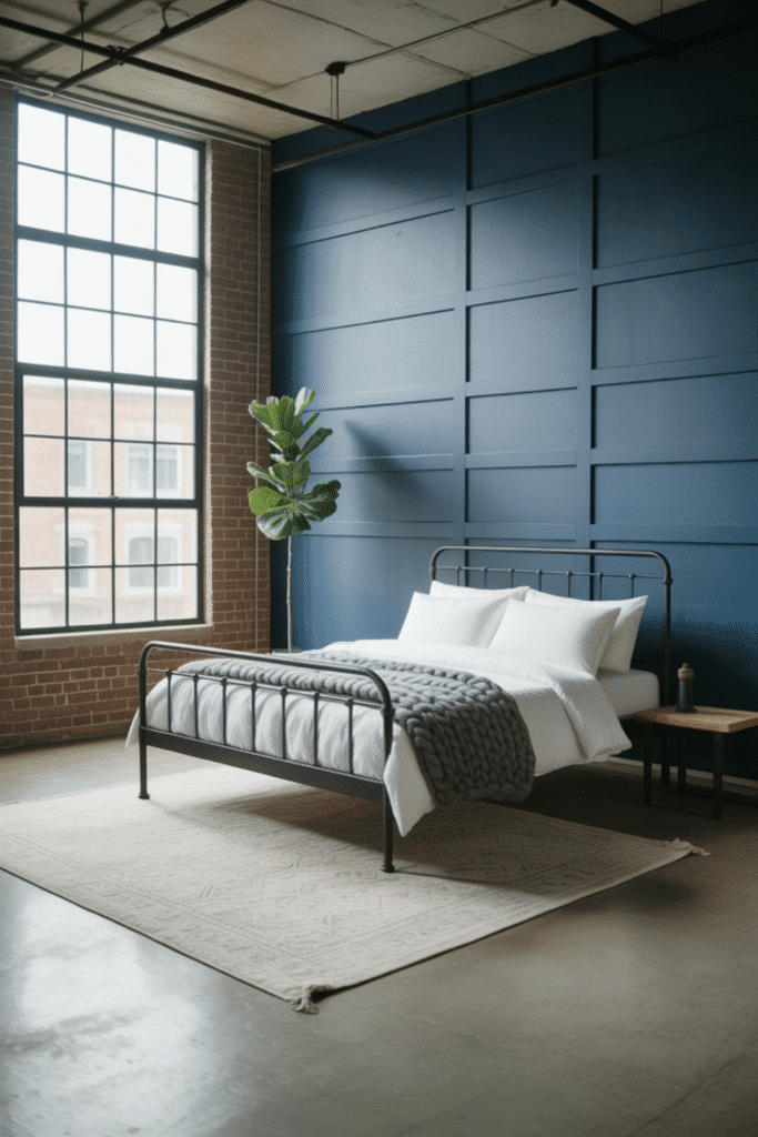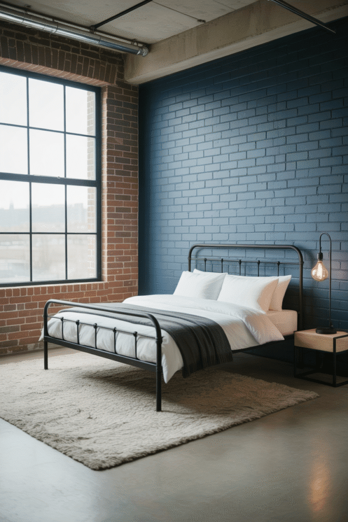 If you love a raw edgy style, navy works beautifully with industrial elements. Pair blue walls with exposed brick, metal bed frames, and raw wood details. The cool tone balances the rugged textures, making the room inviting yet bold.